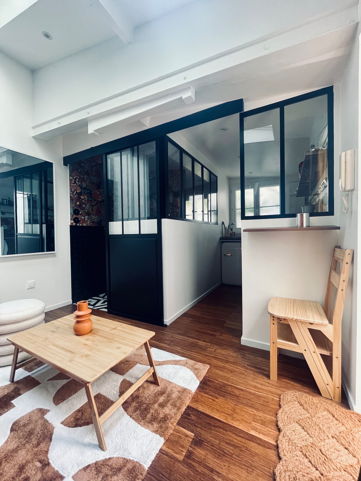 Duplex with bedroom and bathroom upstairs Solid oak parquet flooring, beams and exposed stones. Very charming. You benefit from easy access to all sites and amenities from this central accommodation located 15 minutes from the center of Paris. Near Metro and shops.
