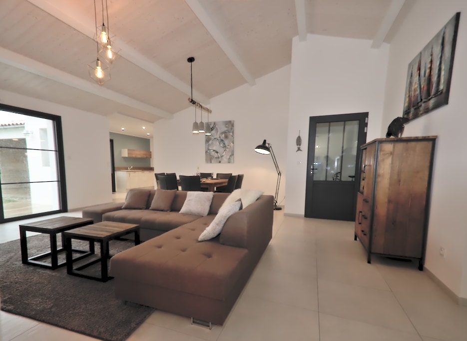 Maison de 2022, chaleureuse, calme et lumineuse de 142 m2, située à 800 mètres des plus belles plages sud et à 450 m du centre du Bois-Plage-en-Ré, disposant d'une grande pièce à vivre avec baie vitrée à galandage, d'une très grande cuisine donnant sur terrasse au calme et de 3 coins nuit séparés (4 chambres, dont 1 à l'étage) ayant chacun leur salle de bain privative avec douche/bain et toilettes. 1 buanderie est également à disposition. Très bien équipée.