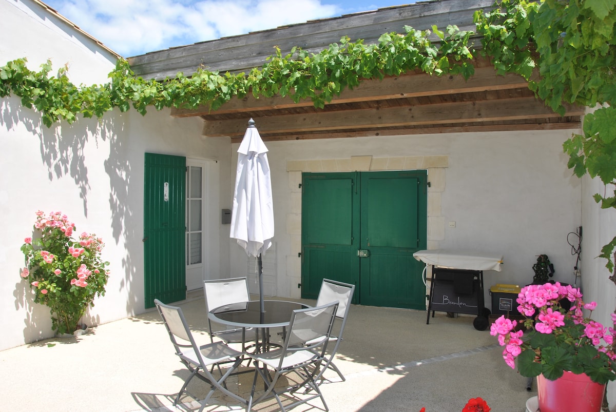 Ancienne dépendance d’une des plus belle maison d’hôte de l’île (Routard/TV), authenticité d’une maison rhétaise confortable et cosy au calme à proximité du marché et des plages avec parking. 2 grandes chambres avec 2 douches à l’italienne et 2 WC, pouvant accueillir 4 adultes et bébé ou 2 adultes, 3 enfants et bb + canapé lit. Draps/Serviettes inclus dans le forfait ménage pour 4 pers. Salle à Manger et Salon TV. Cour à l’abri du vent au calme avec barbecue weber électrique.