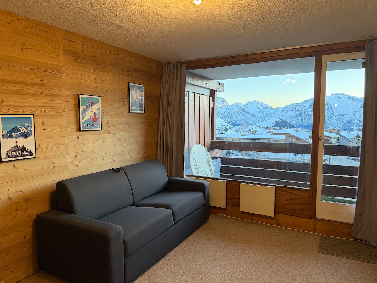 Studio lumineux à l'ambiance montagnarde, exposé sud ouest avec balcon, situé face à la remontée mécanique Alpe Express et commerces (skipass, esf, location matériel, supérette, restaurants, bar, laverie). Pièce à vivre composée d'une cuisine équipée: lave vaisselle, four à micro ondes, cafetière Senseo, grille pain. Canapé-lit (130x190 cm) et 2 lits superposés (80x190 cm) escamotables. Salle de douche et WC séparés, cellier pour rangement. Casier à ski privatif. Draps en supplément sur demande