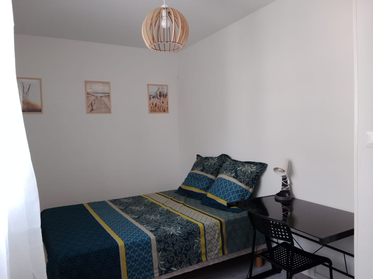 Le logement est situé près du centre, en face de la gare des cars et des navettes. La chambre est au 1er étage de mon appartement (duplex) situé au 4eme étage nord. Elle est équipée d'un lit en 140 de large x 190, d'une télévision, d une table avec 2 chaises et d'une salle de bains privée et W.C. individuel. Vous avez à disposition un micro-ondes, frigo, cafetière, bouilloire, grill pain, presse fruits, vaisselle. Ma cuisine située à mon niveau d'étage peut être utilisée exceptionnellement.
