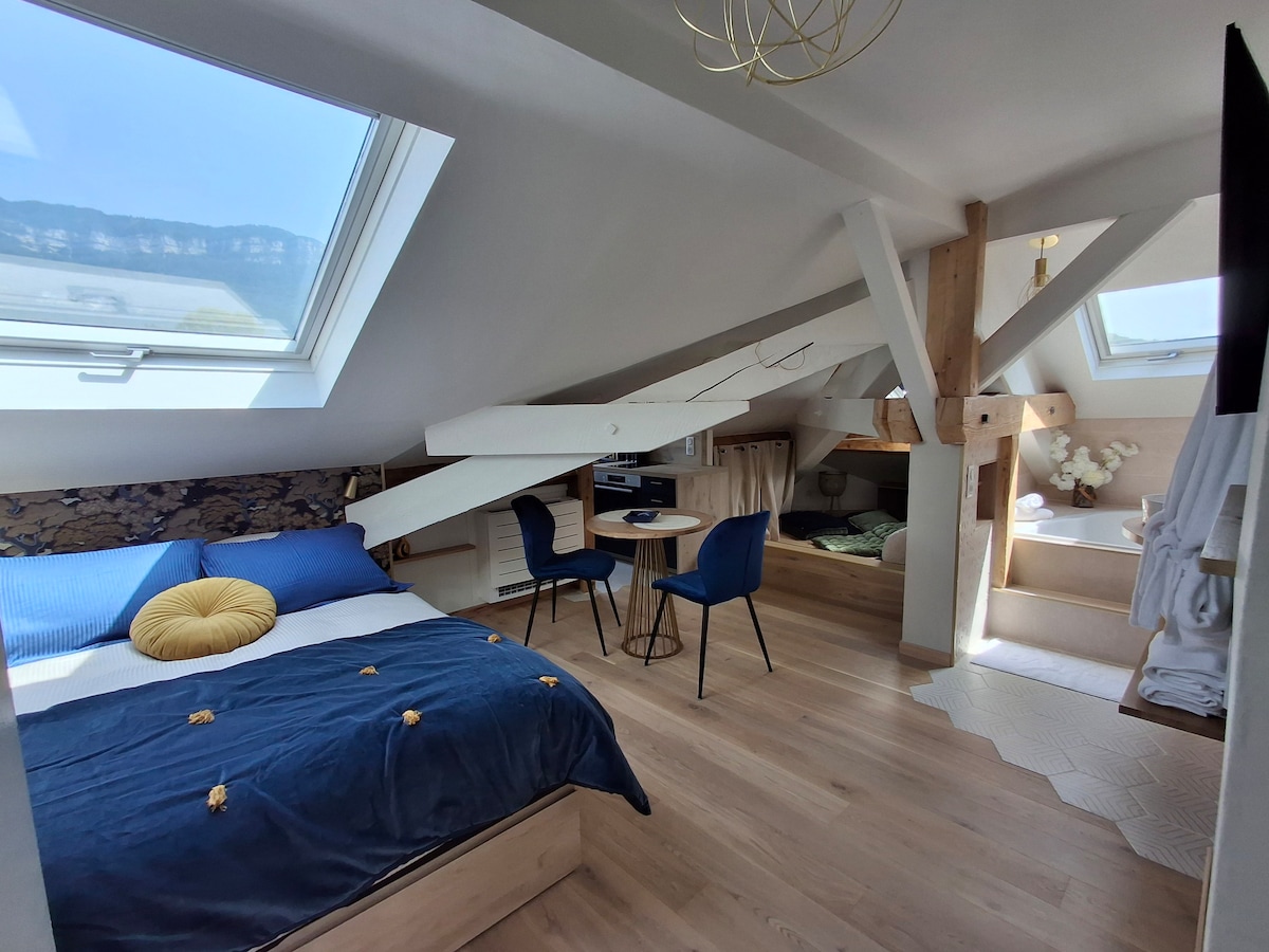 Cette suite de 35 m² possède une vue exceptionnelle sur le lac du Bourget. Une terrasse privative avec vue directe sur le petit port . Vous pourrez vous y admirer la vue. La chambre est séparée de la pièce de vie . De nombreux restaurants sont à proximité ainsi que des activités nautiques et locations de bateaux. La kitchenette est équipée. Nespresso Place de parking privative et accès à la buanderie. Adapté pour 2 personnes maximum. Les bébés et enfants de - de 12 ans ne sont pas acceptés.