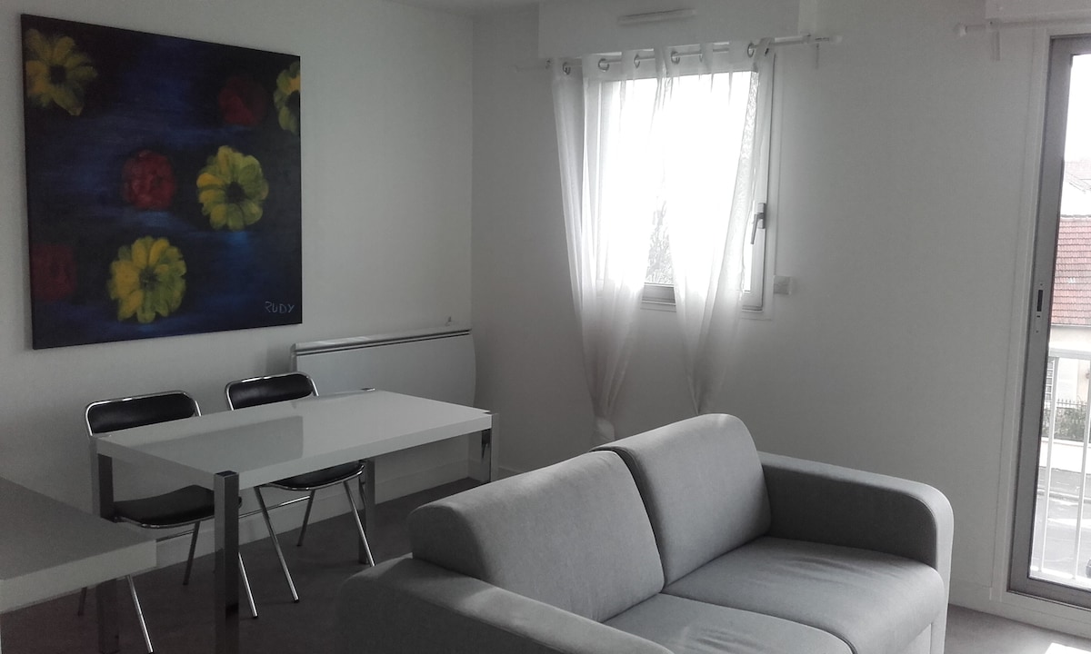 **Appart cocooning entre Paris et Disneyland** À 30 minutes du RER À,Paris et Disneyland. Calme absolu, isolation parfaite, terrasse pour fumer.Stationnement dans la rue.Commerces à proximité et centre médical en bas de l’immeuble. Appart 39,99m2 idéal pour couples, voyageurs solo ou pros. Équipé pour un séjour clé en main : cuisine, salle de bain, salon, TV et vidéo projecteur. Thé/café offerts pour le séjour. Endroit confort et stratégique !