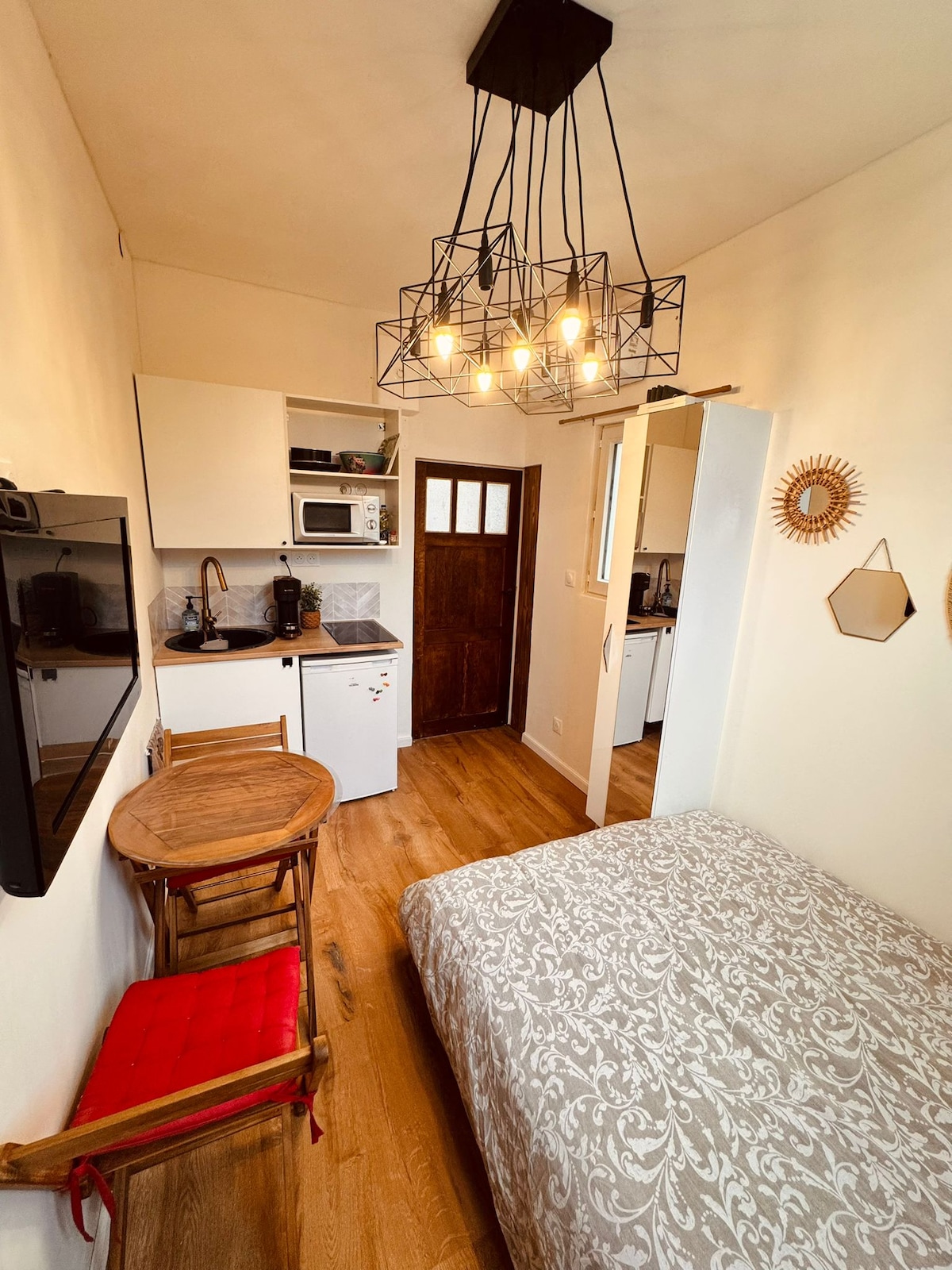 Studio Privé sans espaces partagés cosy "Classé" 1 * Etoile rangements importants, sdb complète,kitchinette toute équipée Machine à laver,TV,wifi,fibre internet, split réversible jardinet privé ombragé avec petit salon extérieur et table a repas très agréable avec ventilateur extérieur quartier hyper calme parking disponible éclairé canapé BZ lit confort 2 personnes possibilité lit parapluie sur un bébé à la demande vers Nice et Marseille accès par autoroute ou RN7 proche