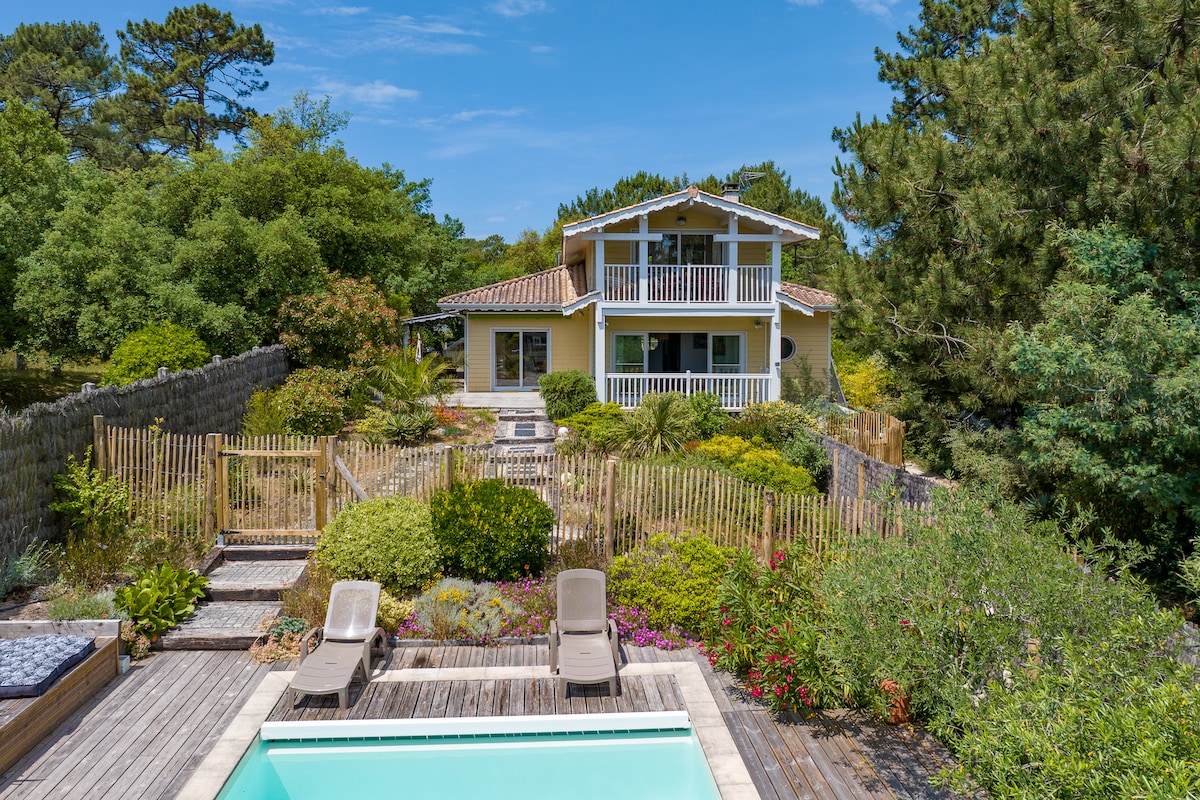Superbe cabane construite dans l'esprit de celles des ostréiculteurs du Bassin d'Arcachon. Entièrement en bois, cette cabane "tchanquée" (sur pilotis) surplombe le sentier du littoral et offre une vue panoramique sur le bassin. Sa disposition surélevée lui vaut le nom de "la Hune" qui désigne une plateforme d'observation installée au-sommet du mât des navires. La maison dispose de 3 terrasses, d'un jardin de 500m2 et d'une piscine au sel. L’ensemble est entièrement privatif.