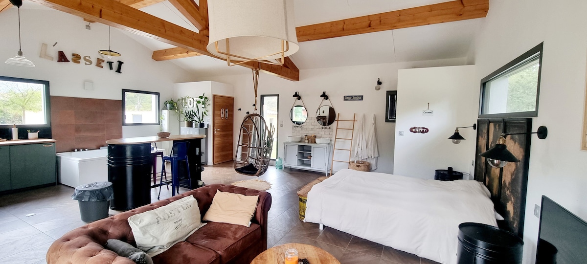 Détendez-vous dans ce studio cosy et au calme au Beausset. En toute saison, vous pourrez profiter été comme hiver du jacuzzi chauffé et privatif qui se trouve à l'extérieur dans le jardin. Vous pourrez profiter du jardin dédié à l'espace du jacuzzi. Le studio rénové avec une literie neuf de 160X200 avec un accès indépendant se situe dans notre jardin de notre habitation principale et sans vis à vis. Stationnement de votre véhicule ou votre 2 roues dans le jardin avec un portail électrique.