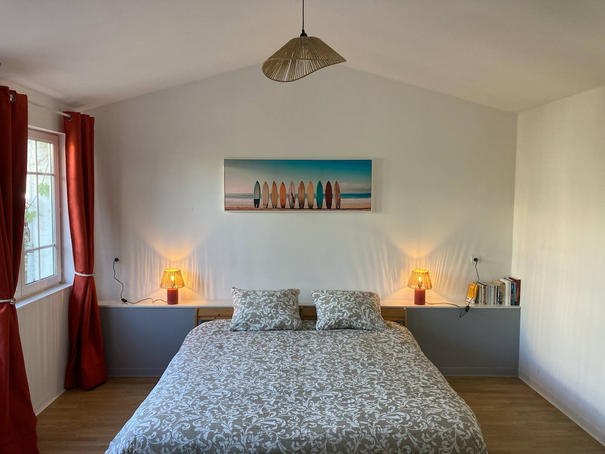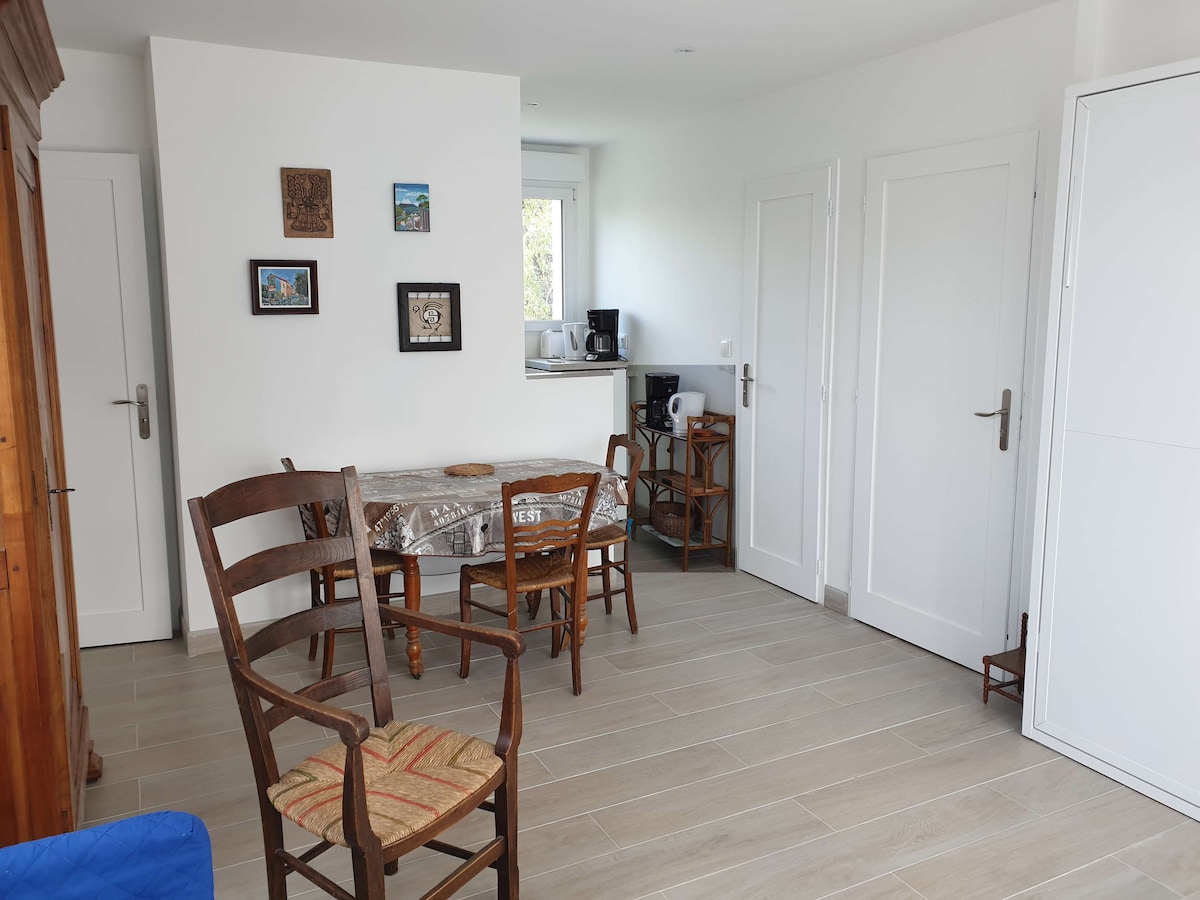 Charme, simplicité, confort, en 20 m2 d'indépendance. Pour globe-trotters : machine à café, bouilloire, grille-pain, micro-ondes, plancha, frigo, vaisselle. Sans plaque ni four. Petite terrasse bois sur le jardin. Et le silence. Au calme d'un village, avec tout près les champs, piste cyclable, forêt, plage au sable fin, couchers du Soleil... Environ à 2 km, le bourg et ses commerces et à peine plus loin, port de pêche, restaurants, marchés et nombreuses activités. Et puis à 700 m, l'océan.