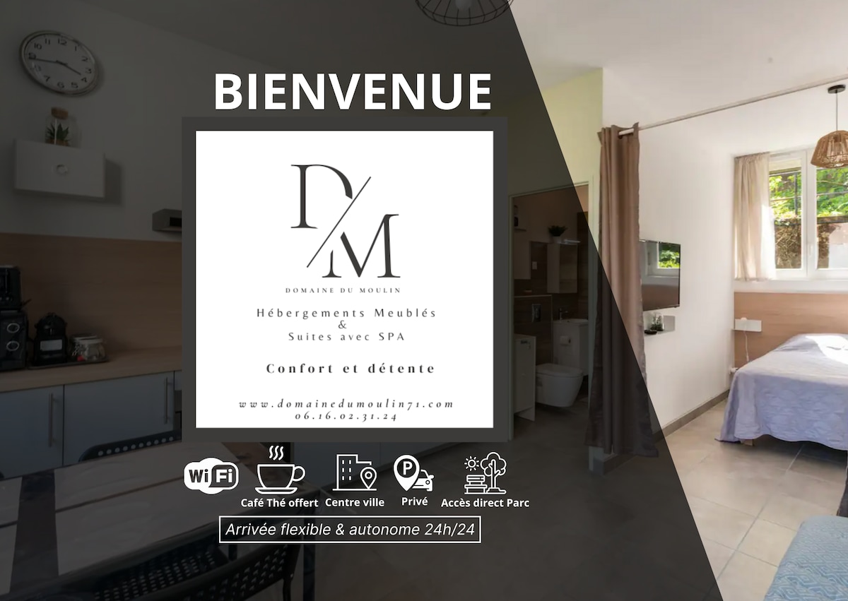 Appartement privatif pouvant accueillir un couple ou une personne seule. Possibilité équipement bébé (lit parapluie, chaise haute). Cafetière DOLCE GUSTO avec café et thé , bouilloire. Parking avec portail électrique, salon de jardin et barbecue. Situé en bordure de campagne à 5 Km de la gare TGV du CREUSOT-MONTCHANIN ( 1h20 de Paris et 40 mn Lyon). A 5mn centre commercial, proche parc d'attraction des combes.