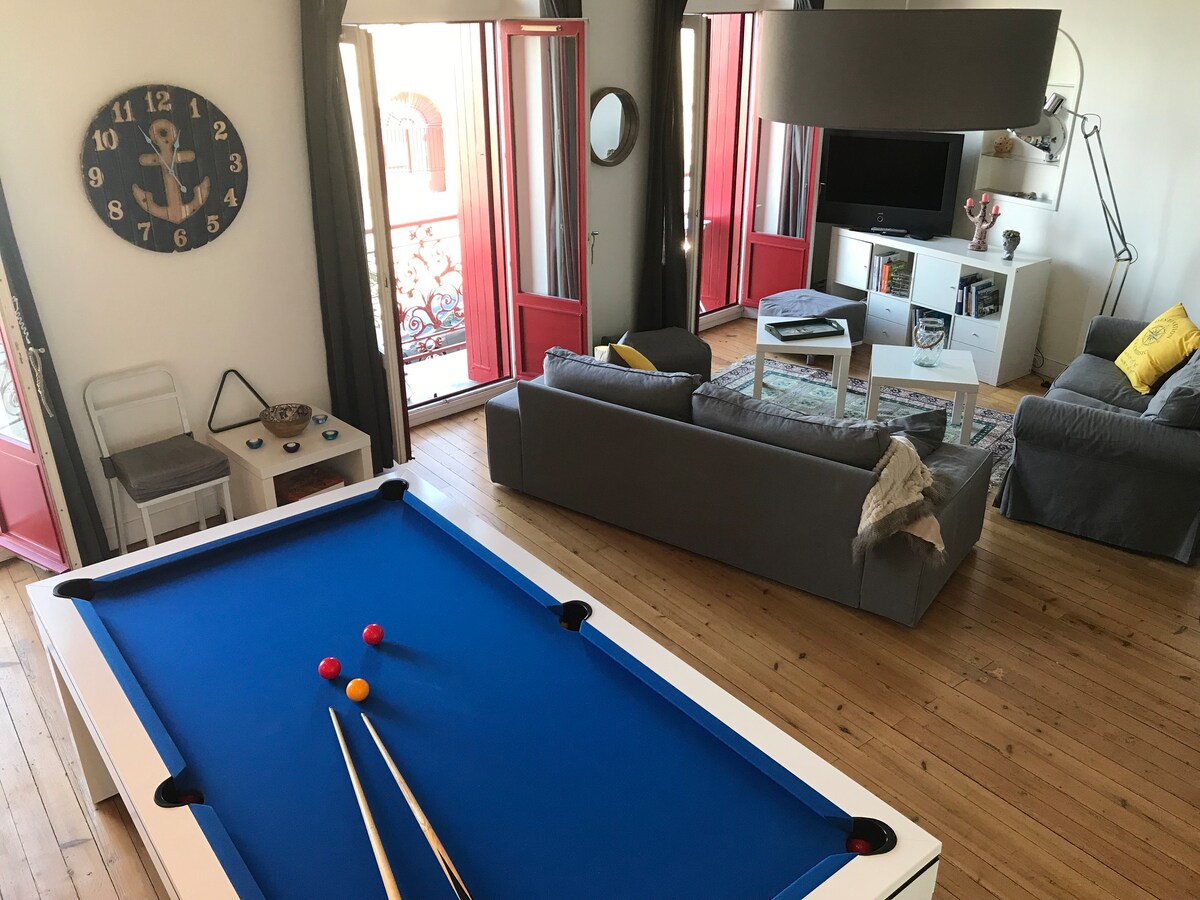 Bienvenue au premier étage de l'Hôtel Masson ! Ce magnifique édifice historique bien connu des Croisicais et des amoureux du Croisic était un hôtel réputé de la fin du XIXème siècle, âge d'or du développement du tourisme dans la Presqu'île. Aujourd'hui transformé en appartements spacieux, la vue y est restée la même; l'ancienne Criée et le traict, reconnu d'intérêt européen, sur lequel les levés et couchés de soleil se suivent mais ne se ressemblent pas au fil des marées et des saisons...