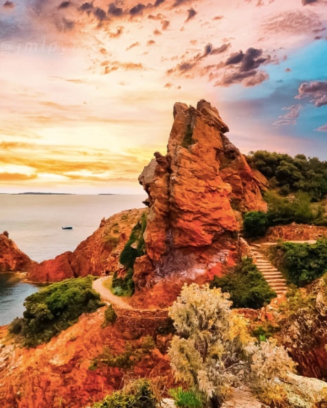Antheor’s bay is located at SAINT RAPHAEL between CANNES and SAINT TROPEZ. To access our place, you will drive on the famous « Corniche d’or », a golden cliff road which is one of the most beautiful panoramic road in Europe. This road is surrounded by the ESTEREL hills; a volcanic redstone elevation covered with a wild forest of oak, Mimosa, and Maritime Pine trees.