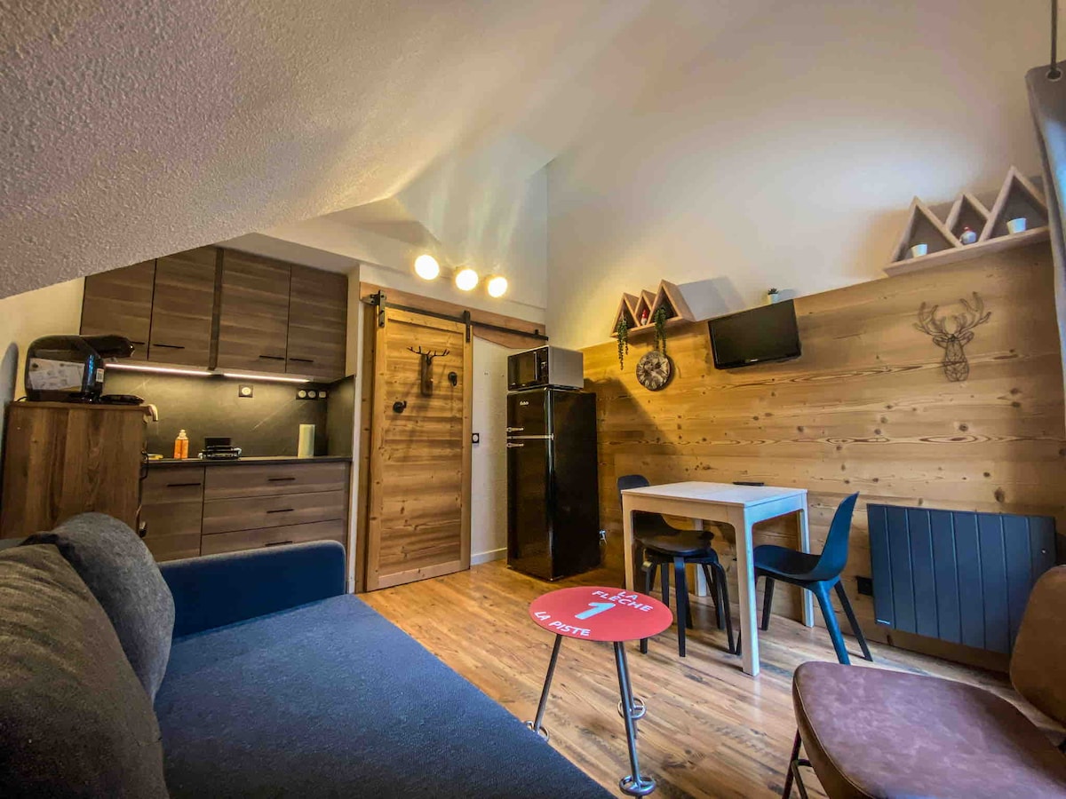 Studio centre station, skis aux pieds à 100 mètres 🌄Vue montagne 🛏️ Literie confortable, linge de lit & de bain inclus 📺 Smart TV/ WIFI Dans l'immeuble vous trouvez au niveau 0 ☕ Coffee Shop "Solar" brunch & bar à jus ouvert en saison hiver-été de 9h à 18h ⛷ Local skis sécurisé, chauffé niveau 0 🧳 Local sécurisé niveau 2 ☀️Restaurants, bars, piscine, patinoire outdoor, nombreux commerces... à proximité.
