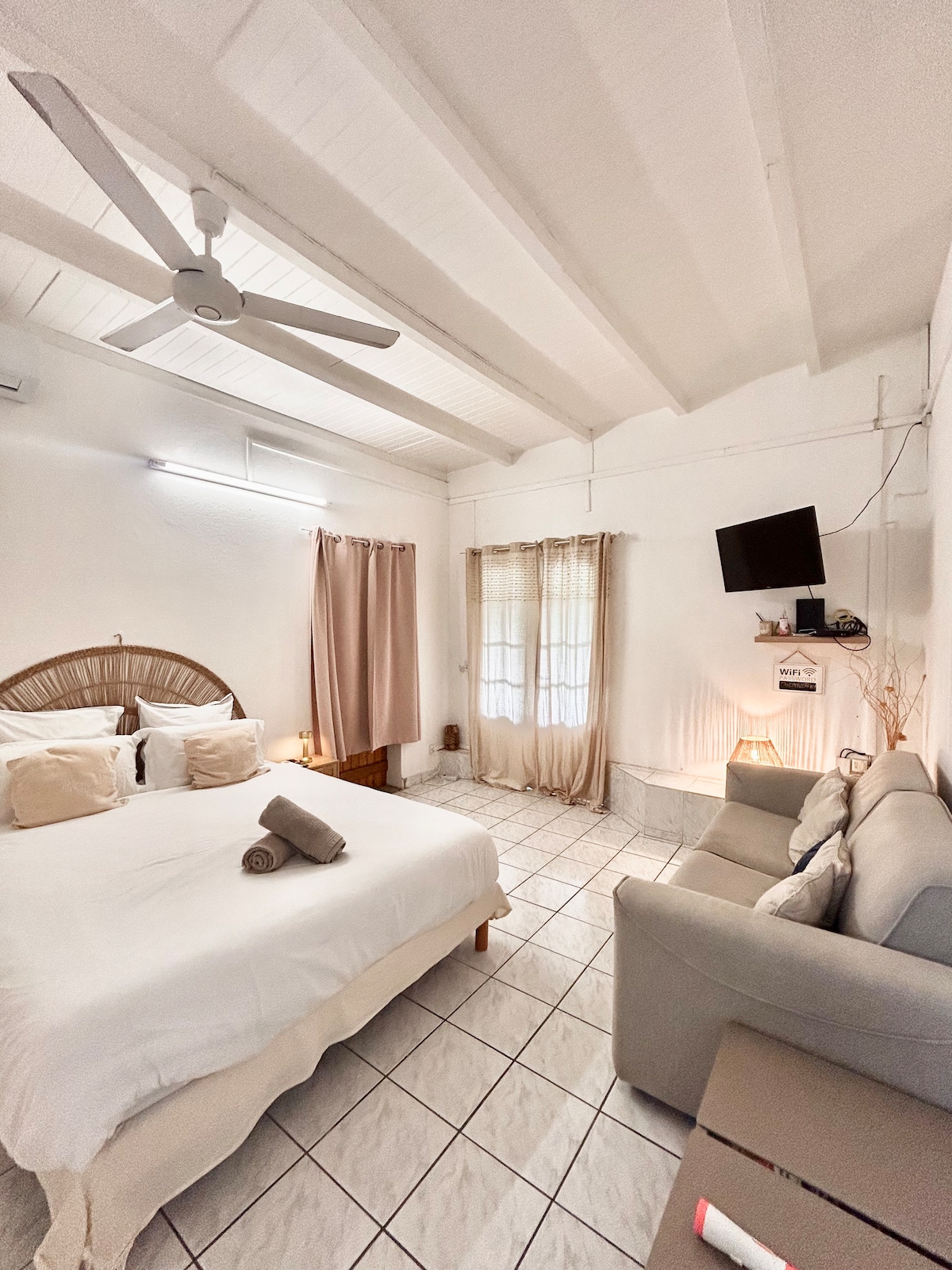 À 250 m à pied de la plage, dans une ambiance tropicale ce logement invite à passer du bon temps entre les visites de l'île et les sorties plage et surf. Il est équipé de : - 2 chambres avec lit en 140, climatisées et équipées de brasseurs d'air, - cuisine équipée, - lave-linge, - salle d'eau, - piscine privative, - citerne d'eau pour éviter les coupures intempestives, - parking fermé.