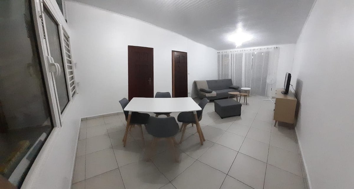 Logement familial de plain pied proche de toutes commodités Deux chambres climatisées (un lit double et un lit Queen size) + un lit simple confortable dans le salon, Salle de bain avec douche italienne, lavabo, WC Toilettes indépendantes avec lave-main Espace salon avec TV et Wifi, Cuisine entièrement équipée, Espace repas à l’intérieur comme à l’extérieur, Grande entrée, Linge fourni, grands placards de rangement. Citerne d’eau connectée au circuit d’eau général en cas de coupure.