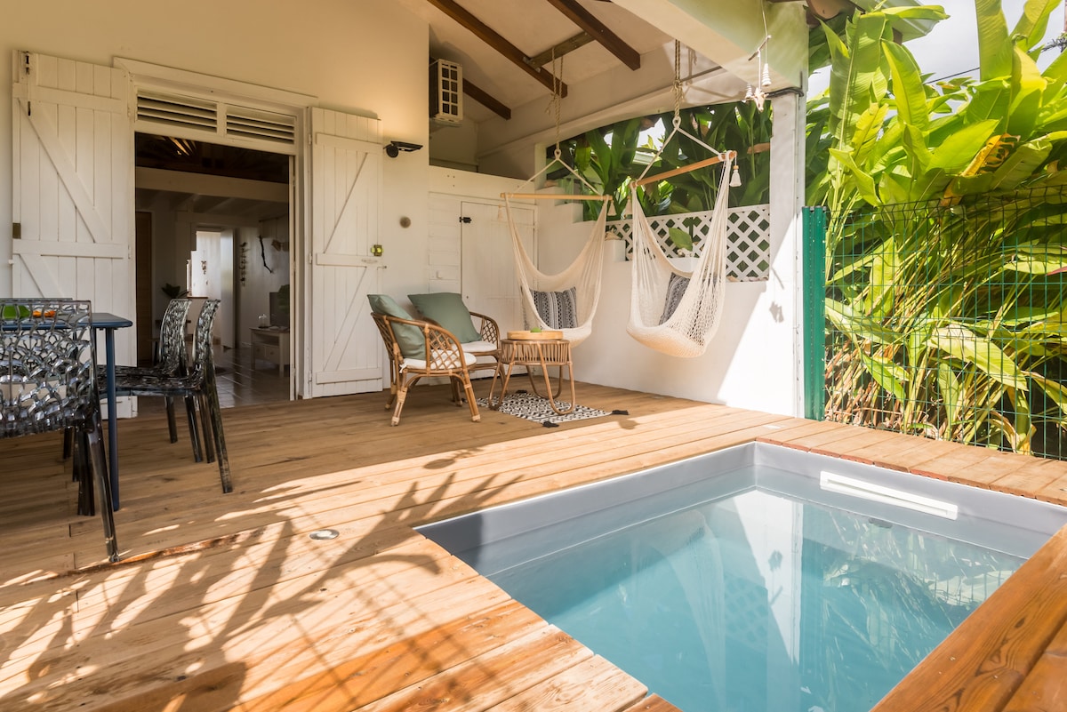 Laissez-vous charmer par le précieux calme de cette petite maison Prenez un moment de détente sur la terrasse où le temps s’arrête, la petite piscine vous fait de l’œil ? Allez-y c’est permis elle n'est rien que pour vous ! Cuisiner deviendra un plaisir avec la vue imprenable sur les cocotiers La nuit tombée laissez vous bercer par le chant des grenouilles pour un moment dans la piscine, levez la tête le ciel s'allume ! Contemplez les étoiles et laissez vous emporter par ce moment magique