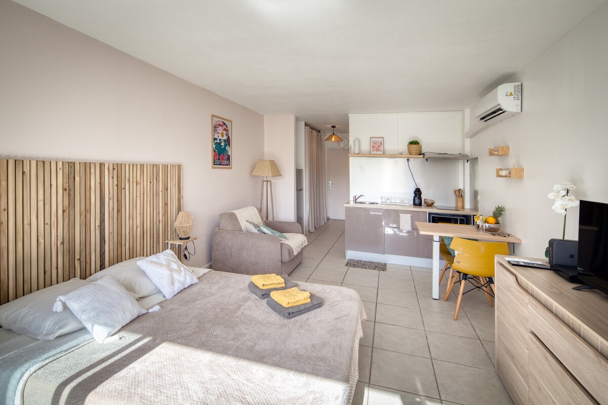 Studio rénové en Septembre 2024, climatisé, en rez-de-jardin dans une résidence ancienne, clôturée, calme et sécurisée, en cours de rénovation. Terrasse ouverte sur un jardin avec accès direct à une plage avec galets par un portillon sécurisé avec code ; plage de sable fin à 300 m. Piscine privée entretenue (en attente de rénovation). Parking extérieur. Citerne installée dans le logement pour votre confort en cas de coupure d’eau.
