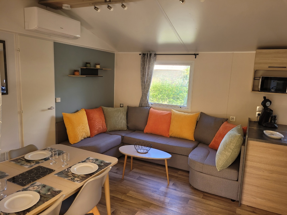 Grand mobile home neuf de 2024, avec une capacité de 6 personnes (une chambre parentale, deux chambres avec chacune 2 lits simples), deux salles de bain et 2 wc. Un grand canapé velours marine très confortable vous accueille, un espace repas à l'intérieur et un autre sur la terrasse couverte vous permet d'être dedans/dehors et de profiter de tout l'espace au calme. Les équipements sont de qualité, dans des tons neutres et élégants, avec en prime un superbe jardin paysagé et 2 places de parking.