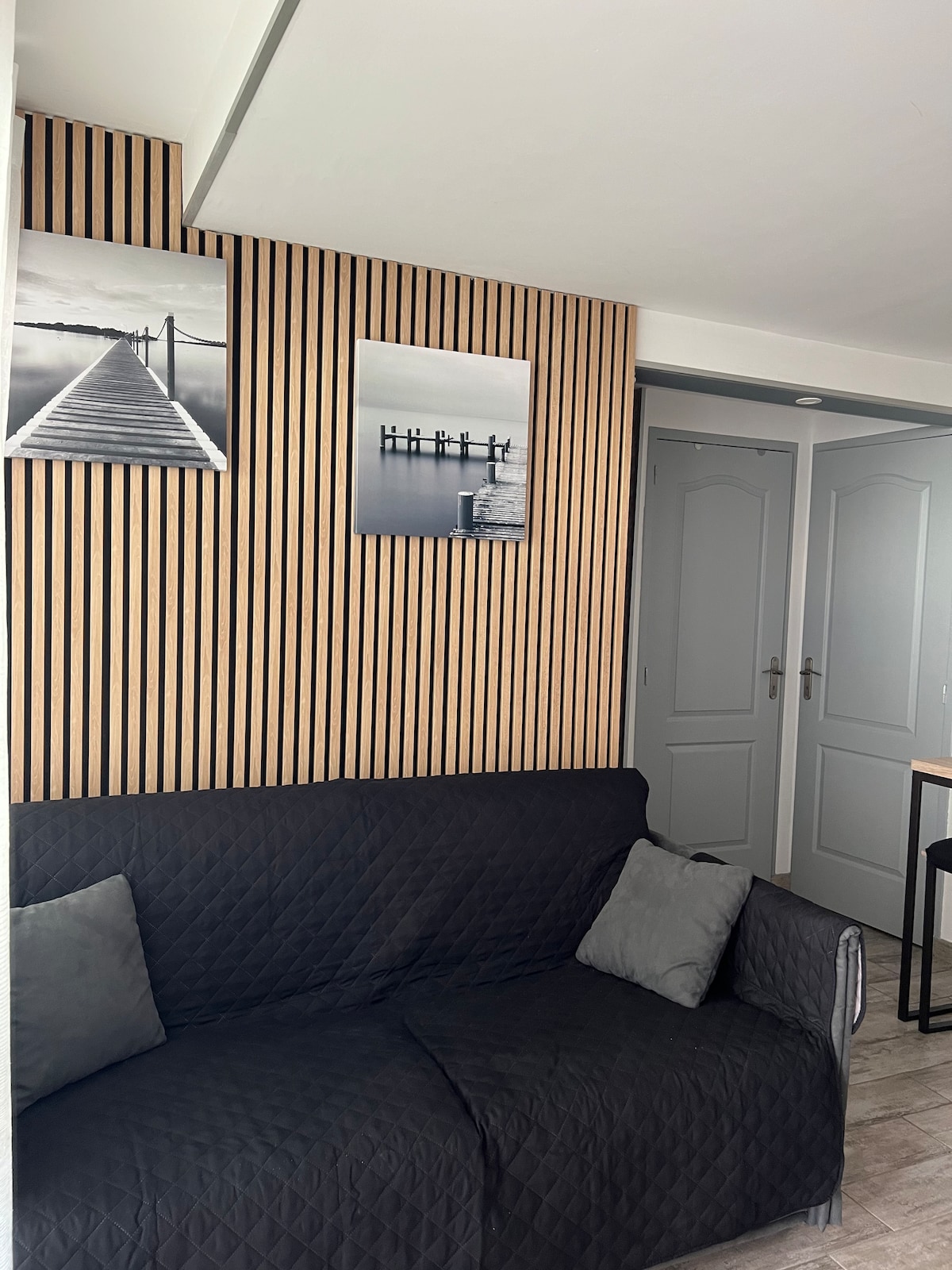 Profitez d'un logement élégant et central. L'élégance se mêle subtilement à la lumière naturelle, créant une atmosphère accueillante et chaleureuse. Dans le salon, une grande baie vitrée donne sur une terrasse confortable orientée sud avec vue sur le port de plaisance et la marina. Un canapé convertible poltronesofa vous offre un veritable couchage de qualité, complété par deux lits superposés encastrables prévus pour deux enfants. C’est un espace où l’on se sent instantanément en vacances.