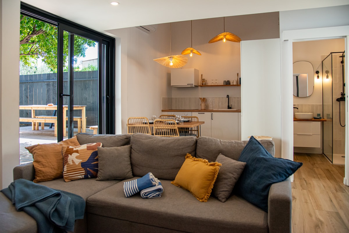 Offrez-vous une pause dans le duplex Mandarine, entièrement neuf et équipé, décoré et aménagé avec soin et soucis du détail. Classé **** Profitez d’une généreuse terrasse bois ombragée par un magnifique mandarinier, et d’un jardin paysagé sans vis à vis, orienté sud. Un espace nuit mansardé en mezzanine avec un lit 2 places. Un confortable et spacieux espace de vie en bas équipé d’un canapé lit (2 personnes). L’ensemble du studio est climatisé et bénéficie d’une lumière traversante.