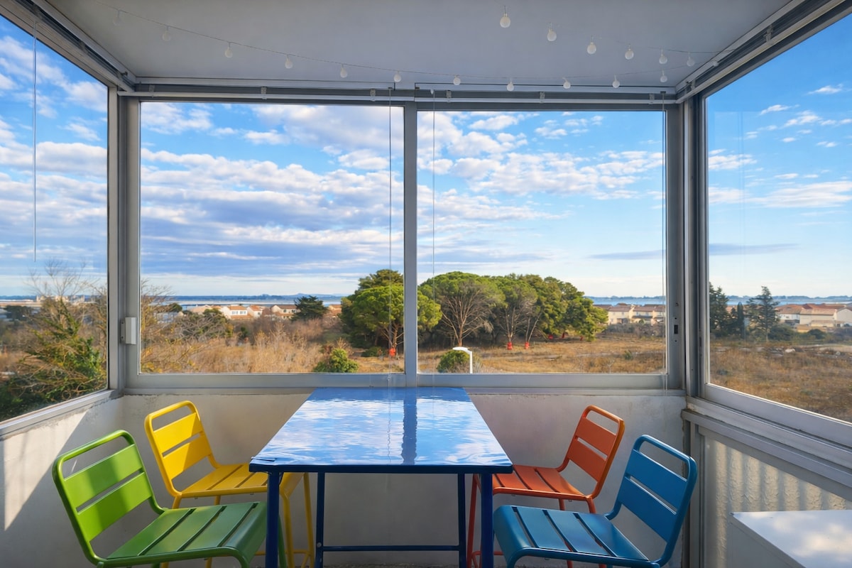 Appartement rénové comprenant une grande pièce à vivre avec cuisine américaine et canapé convertible lit 2 places, un petit couloir desservant WC, SdB avec Lave Linge et Sèche Linge, puis grande chambre avec lit 2 places plus un "coin mer" équipé de 2 lits gigognes. TV écran plat dans salon et dans chambre. WIFI FIBRE HAUT DÉBIT disponible gratuitement. A 200m de la plage, idéal en famille. A 5 mn des plages de la Grande Motte.