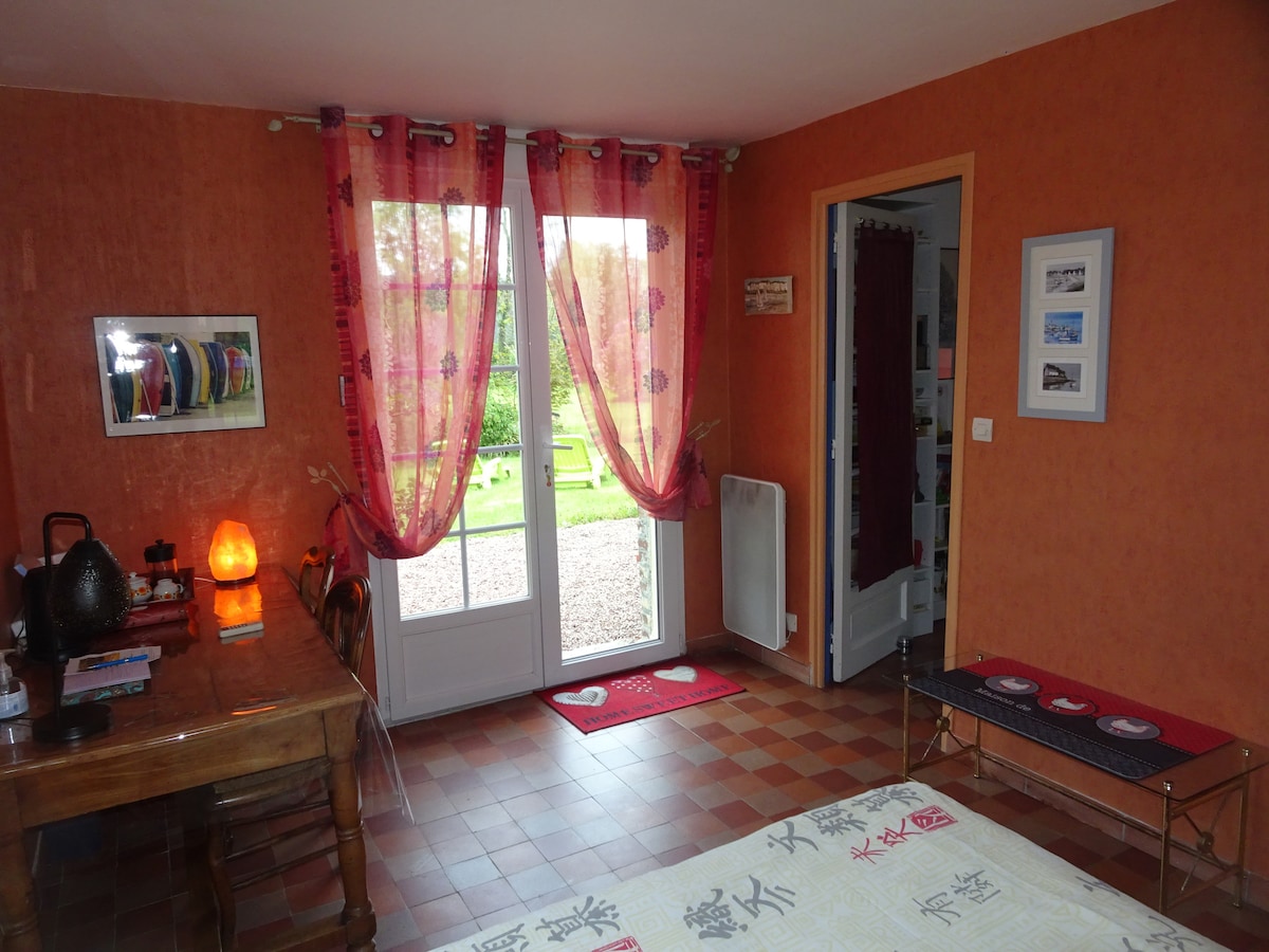 Comme un petit studio Chambre privée de 20m2 proche Honfleur, Deauville, Etretat, Le Havre. Idéal pour les professionnels travaillant sur Le Havre ou Tancarville. Au 1er étage Votre chambre toute équipée vaisselle frigo bouilloire micro onde, salle de bain partagée, toilettes privés au RDC. Jardin de 3 000 m2 avec trampoline et coin détente. Petit dej en supplément Eau chaude à toute heure, WIFI gratuit, lit fait à votre arrivée, linge de toilette fourni. VOUS AVEZ VOS CLES PAS DE COUVRE FEU