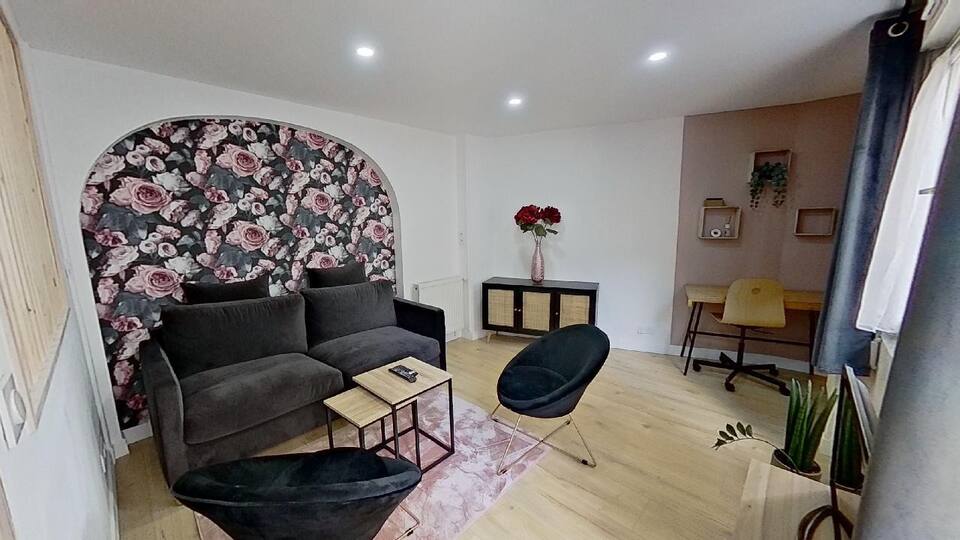 Un patio luxuriant ou fougères arboricole et glycines vous offriront un espace de fraicheur et de calme avant de monter découvrir votre appartement . Vous serez baigné dans un espace reposant, atypique, sombre et lumineux a la fois . Mur en tapisserie noir et or. Douche en marbre noir une literie xxl , pour passer une nuit torride ou contemplative au reflet des miroirs . Le petit plus non négligeable la situation géographique emplacement numéro 1 sur Honfleur .