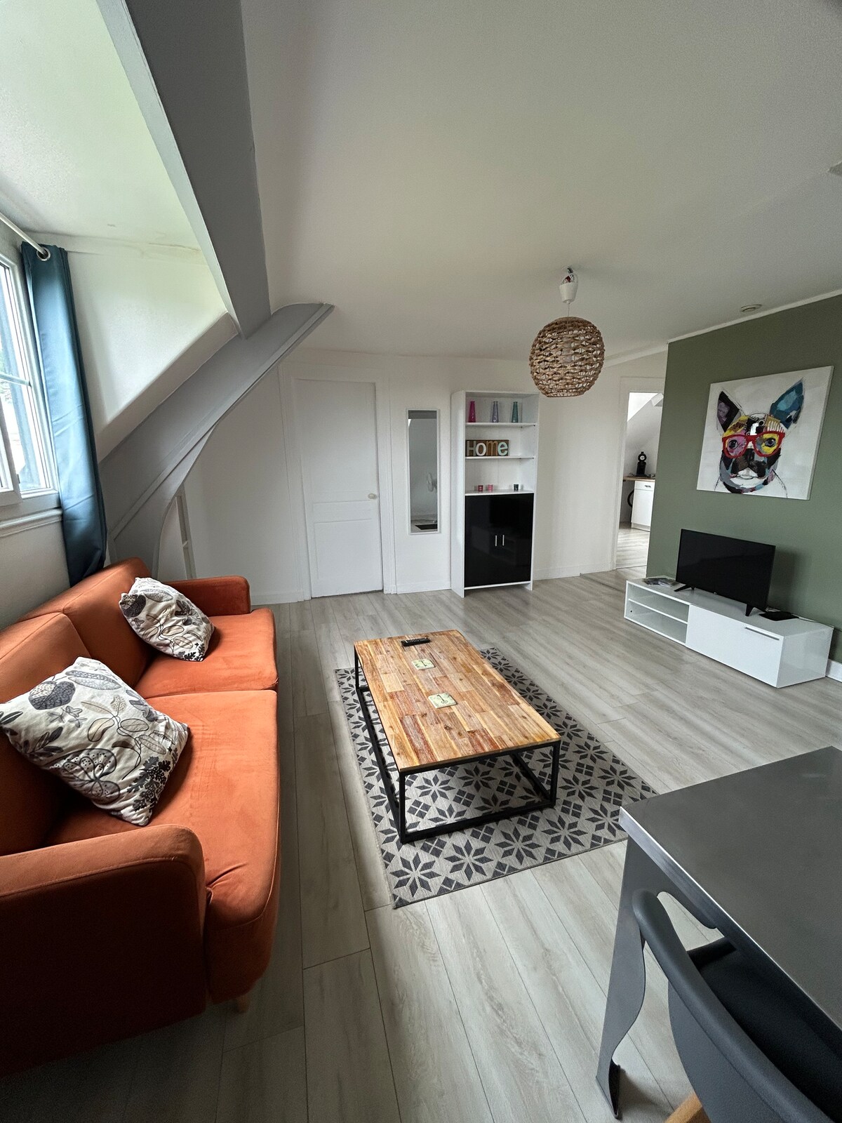 Les Câlins d'Honfleur was born out of a love affair with the town of Honfleur, its atmosphere, its narrow streets, its old basin. I imagined a welcoming place, in the heart of the historic district, 50 meters from the church of St. Catherine, easy to live, quiet and comfortable. Pierre's 41 M² apartment offers you all the comfort, a large separate bedroom with its Queen Size bed, a large living room / dining room with a fully equipped kitchen, a shower room and separate toilet.