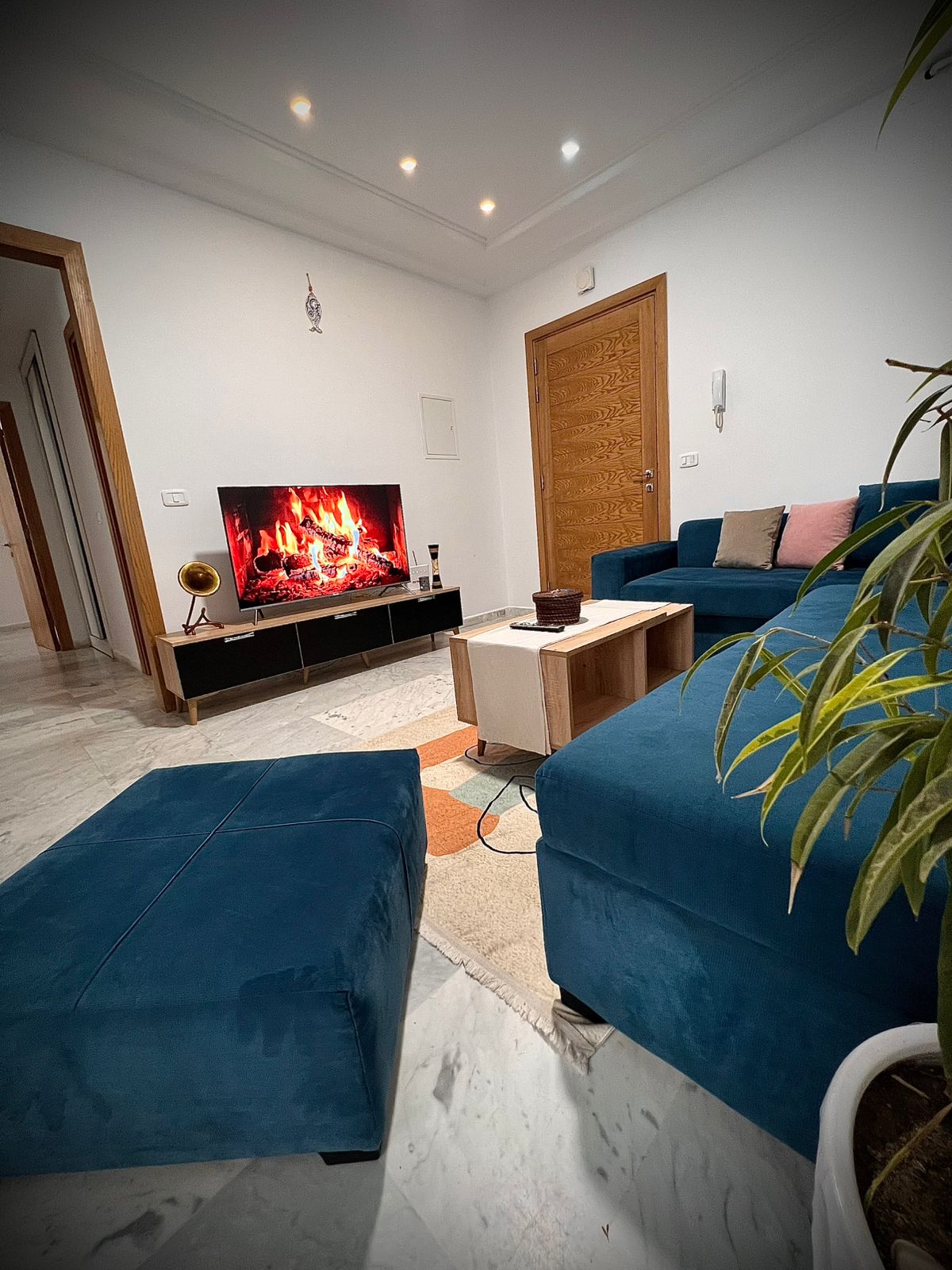 Détendez vous dans ce logement calme et cosy, luxueusement équipé et avec un décor harmonieux assurant un séjour agréable. L’appartement est situé dans une zone résidentielle calme, comprend un salon avec un canapé-lit , une chambre à coucher avec balcon et une Kitchenette bien équipée. 📍Niché à proximité de toutes les commodités: Carrefour, restaurants, cafés, lounges, salle de sport, pharmacie… L’aéroport de Tunis Carthage est à 5 minutes.