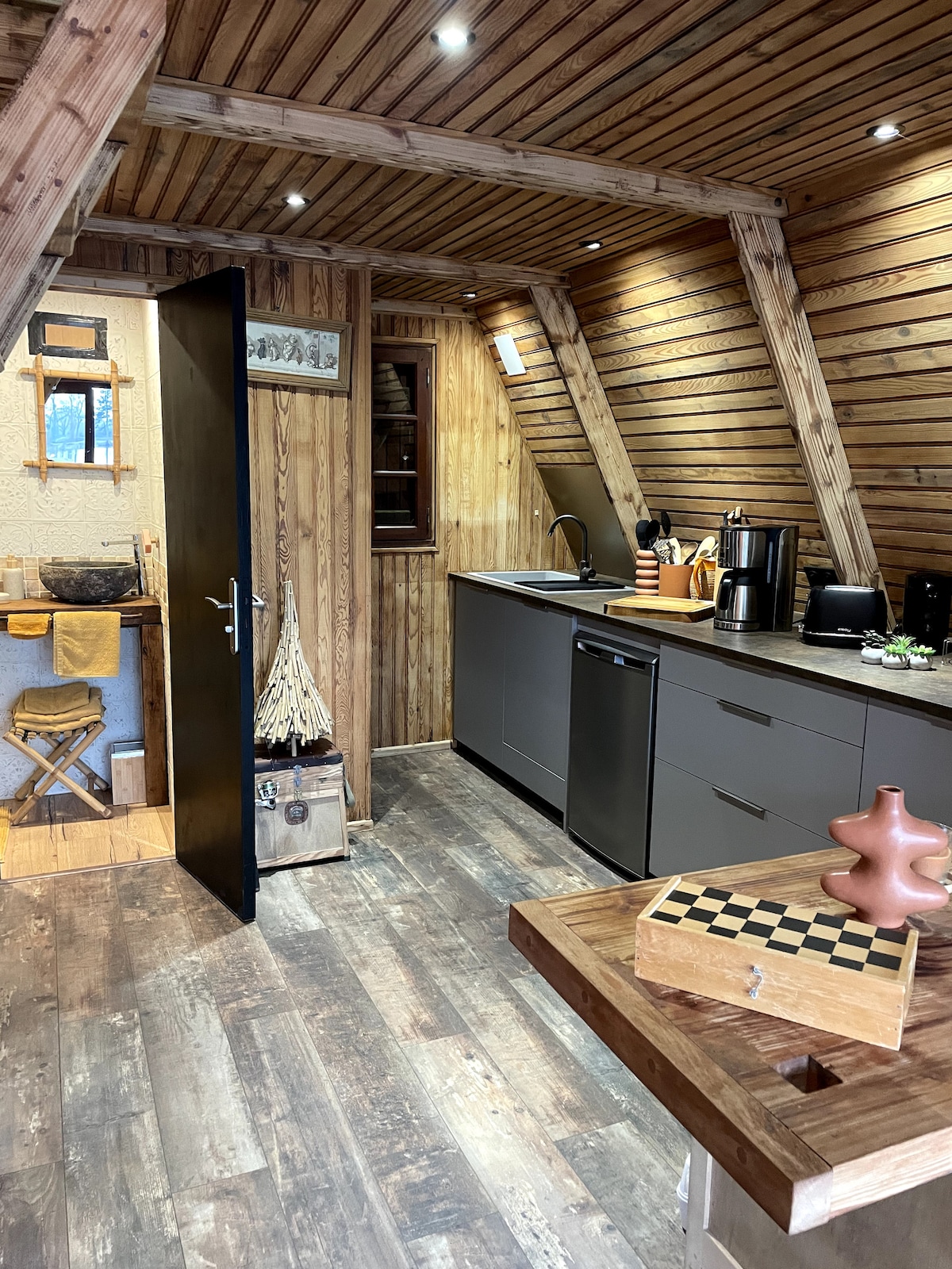 Niché au cœur des vergers sarthois, venez vous relaxer le temps d'un instant au sein de cette Sacrée cabane ! Notre Tiny house a été entièrement pensée pour que vous passiez un vrai moment d'évasion en amoureux, entre amis ou bien en famille. Que ce soit en admirant le coucher du soleil ou les étoiles dans le bain nordique, profitez d'un moment de détente unique. Au petit matin, vous pourrez déguster votre petit-déjeuner (inclut)sur la terrasse et du "coffee corner".