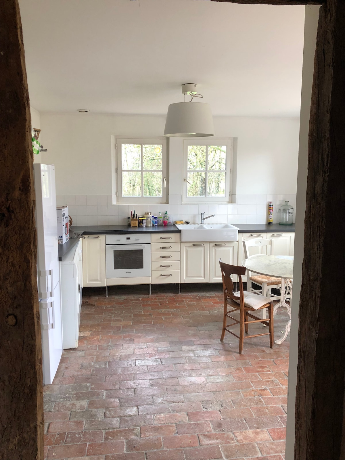 Jolie maison percheronne en colombage, rénovée de fond en combles en 2010 avec tout le confort, mais en lui gardant toute son âme. Un endroit où tout le monde semble se sentir bien, avec des journées au soleil dans le grand jardin plein sud, ou près de la grande cheminée l’hiver. 2 chambres cosy au 1er étage (1 avec lit double et 1 à 2lits simples), et en bas, après le grand salon/s à manger de 50 m2, un petit bureau avec 1 lit simple et une grande cuisine equipée pleine de lumière. A bientôt
