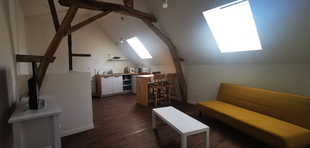 Coup de cœur assuré. Triangle d'or du Mans (cathédrale du Mans) le calme en plein centre ville. Appt style loft "les coquelicots" (duplex atypique) le charme de l'ancien avec le confort en + ! appartement avec poutres et escalier de type meunier (légèrement raide) Duplex dans un hôtel particulier du 19e siècle avec vue sur la cathédrale du Mans. Tranquillité au pied du plein centre ville. (place des Jacobins, Cathédrale, cité médiévale, tram, commerces, cinémas, théâtre, jardin des plantes).