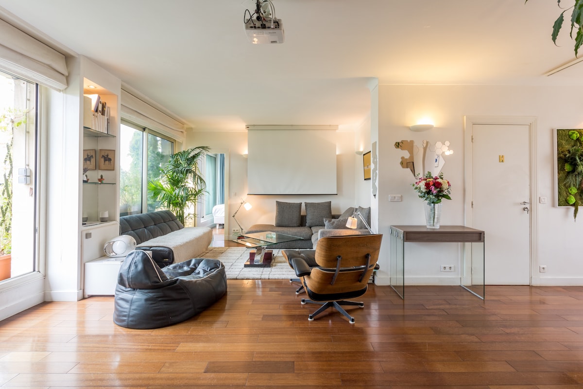2 master bedrooms plus a sofa bed, 2.5 baths, 6 guests, 2150 Sqf, lift, AC, facing south on a pedestrian area. This newly redone apartment . of 2150 square feet is in a modern building next to the museum of Modern Art, in le Marais. The living room set upstairs overlooks the gorgeous rooftop of 1615 sq ft with his flowers, tomatoes plants and even a palm tree. It also has a grill, long chairs and a outdoor table for 6 people. Feel free to contact me if you do have additional questions.
