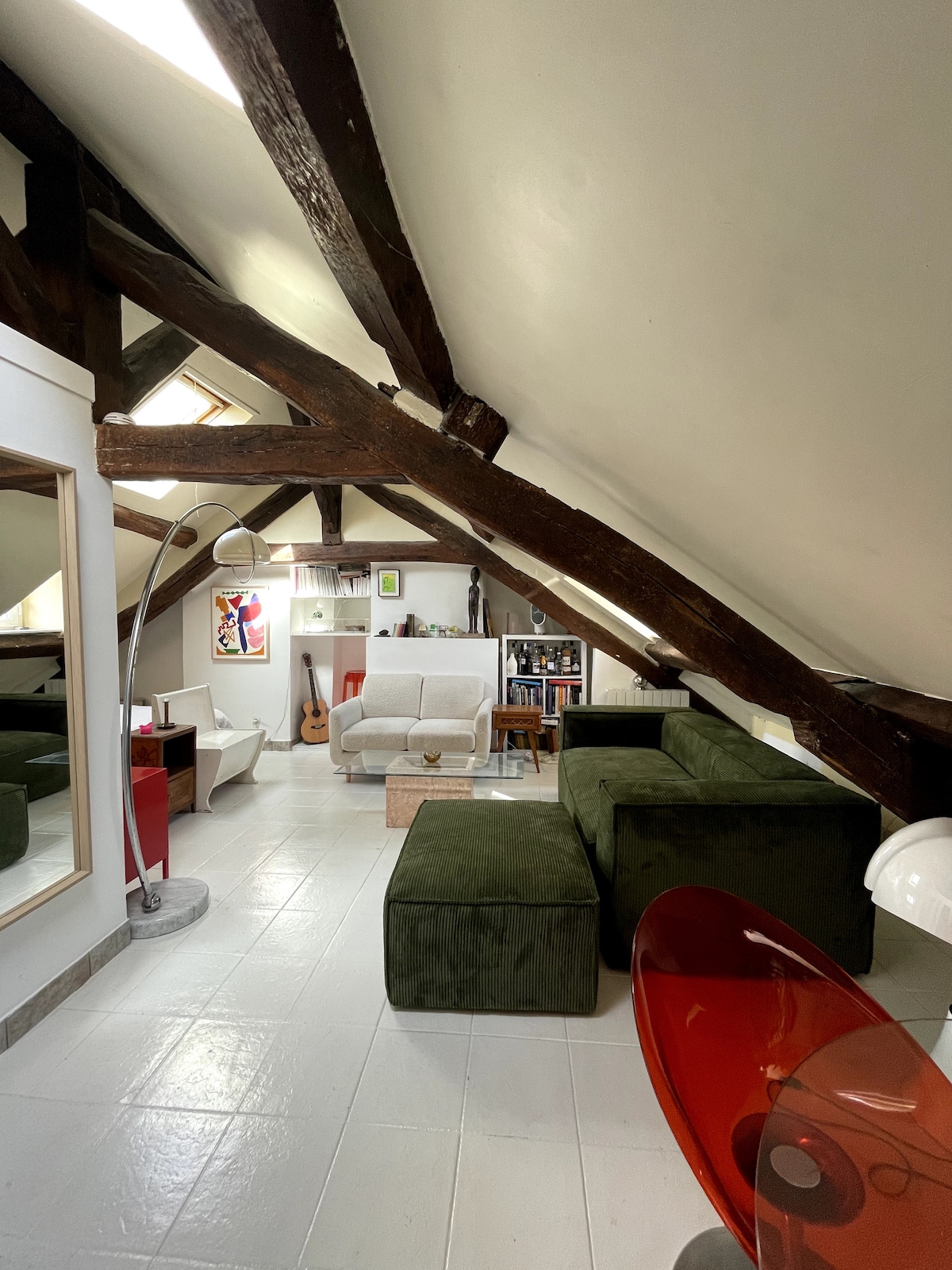 Cet appartement de caractère est situé dans le quartier historique et animé du Marais, au calme sur une jolie cour arborée. Vous serez séduits par son esprit maison de campagne, ses meubles, ses objets et œuvres d’art choisis avec soin. L’appartement est composé d’une grande pièce à vivre lumineuse sous une verrière, d'un petit salon, d'une chambre, d'une salle de bain et d'une douche. Ce lieu poétique, calme et lumineux, est le pied-à-terre idéal pour vos séjours parisiens !