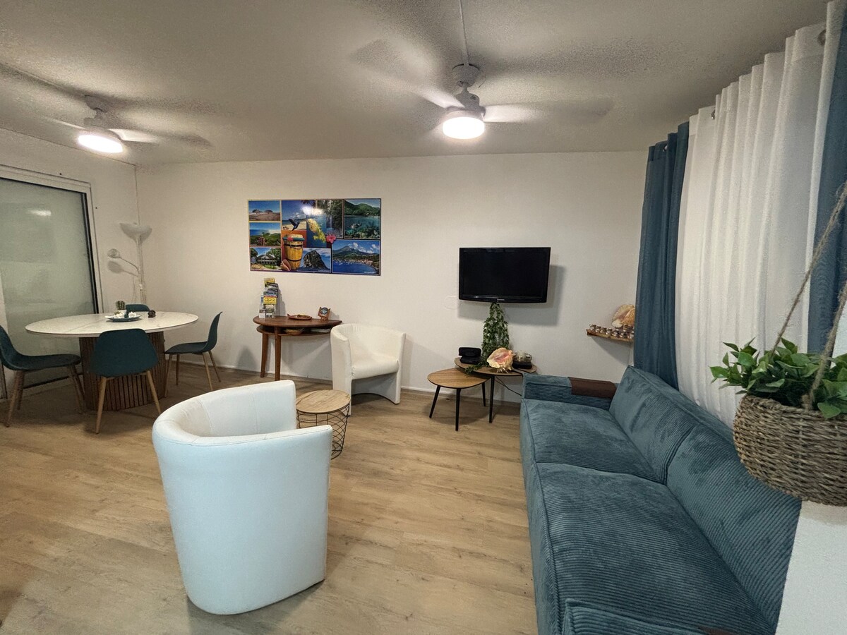 Beau F3 avec vue sur mer et sur la caravelle, proche de toute commodité. À 5 min du centre ville et de la plage de cosmy. À 10 min dès plages de tartane sans oublié la plage réputée des Surfeur. Idéalement situé pour découvrir à la fois le nord et le sud de la Martinique. Vous pourrez bénéficier d'un emplacement ventilé et un quartier calme. Sur demande : Balade Buggy Possibilité de 2 couchers supplémentaires non inclus dans le prix de base