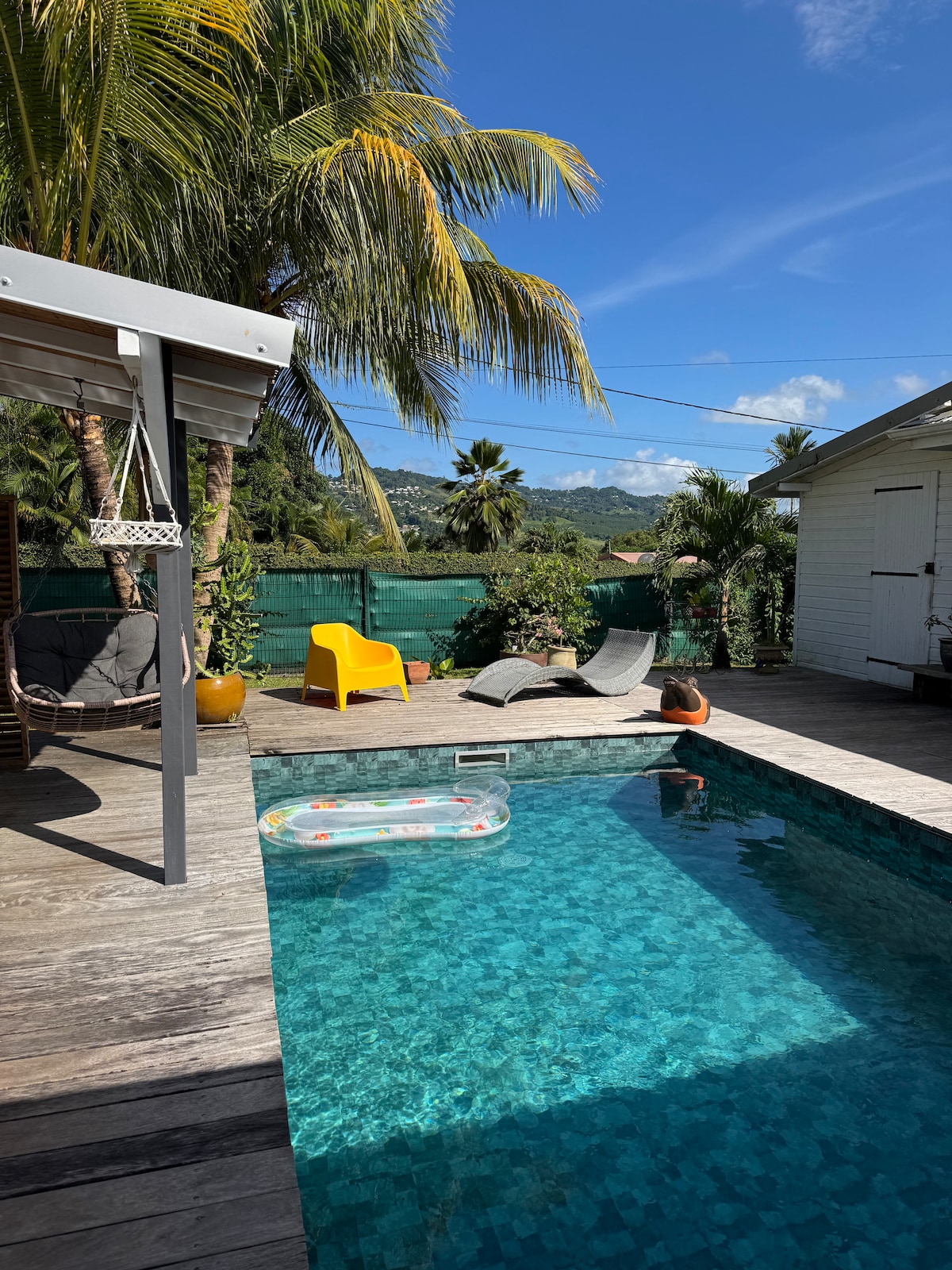 Quiet, romantic 2-room apartment 105 m2, intimate with its private "pool house" space, just for you whith: spa, swimming pool, barbecue, plancha, Ping Pong and relaxation area. All in a green setting with a panoramic view of the Caribbean Sea, Mount Pelée and the bay of Fort de France. Restaurants and shops are 2 minutes by car from Bourg des Trois-Ilets and the most beautiful beaches are 10 minutes away.: The best geographical location for visiting the island. Closed parking. Fiber internet