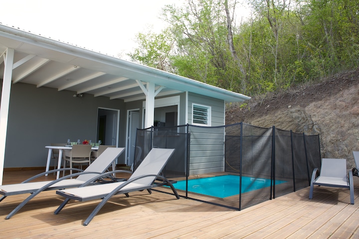 Dans un lotissement calme très bien situé, (10 min des plages, 2 min en voiture de toutes commodités) villa F5 moderne séparée en deux lieux d habitation totalement distincts, vous occuperez l’appartement F3 de 100 m2 avec sa piscine 8*4 m donnant vue campagne. Jardin arboré Une chambre 12m2 un bureau 8 m2 climatisés Salle de bain avec douche à l italienne et wc Un wc indépendant Séjour climatisé ouvert sur cuisine américaine 40 m2 entièrement équipée Véranda 18 m2