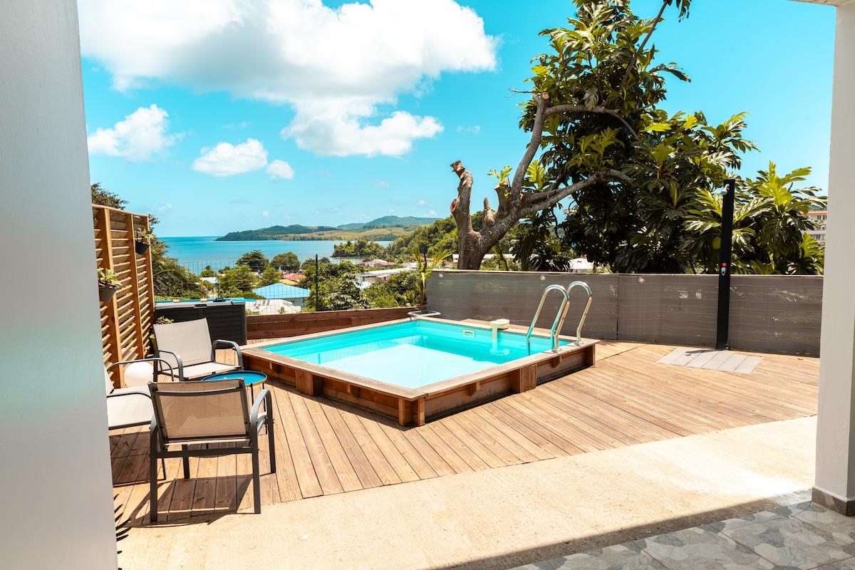 Quiet, romantic 2-room apartment 105 m2, intimate with its private "pool house" space, just for you whith: spa, swimming pool, barbecue, plancha, Ping Pong and relaxation area. All in a green setting with a panoramic view of the Caribbean Sea, Mount Pelée and the bay of Fort de France. Restaurants and shops are 2 minutes by car from Bourg des Trois-Ilets and the most beautiful beaches are 10 minutes away.: The best geographical location for visiting the island. Closed parking. Fiber internet