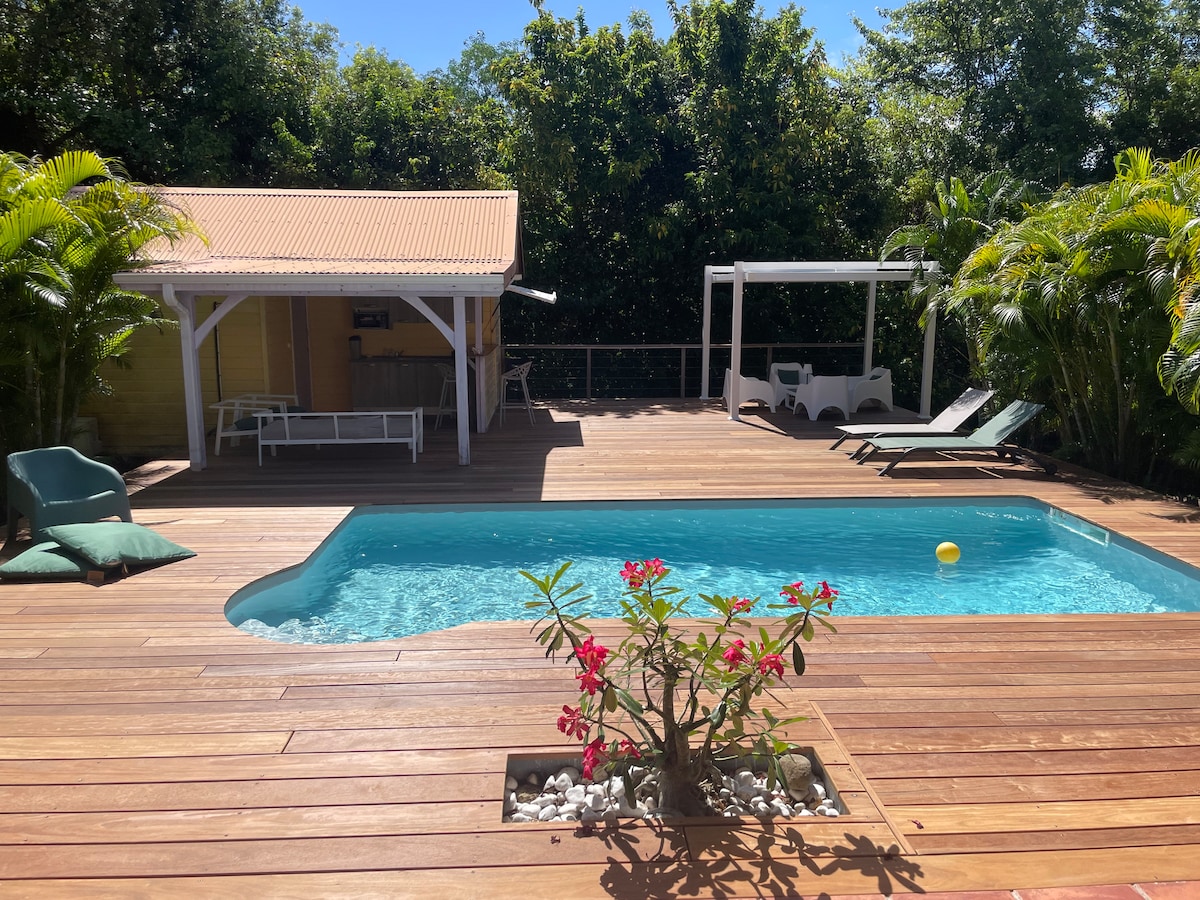 Venez vous détendre dans ce charmant bungalow. Très cosy, vous trouverez dans ce bungalow 1 chambre avec 1 lit et 1 canapé convertible. Idéal pour 1 couple, et 2 enfants si besoin. Une salle d’eau, et une cuisine équipée située sur la terrasse comme cela se fait beaucoup en Martinique. Vous pourrez vous prélasser dans la piscine bac à punch de 2,50 par 3m. Idéalement situé, vous serez à 10 minutes à pied de la superbe plage de Mabouya, à 3 minutes en voiture de la RN et à 15km de l’aéroport.