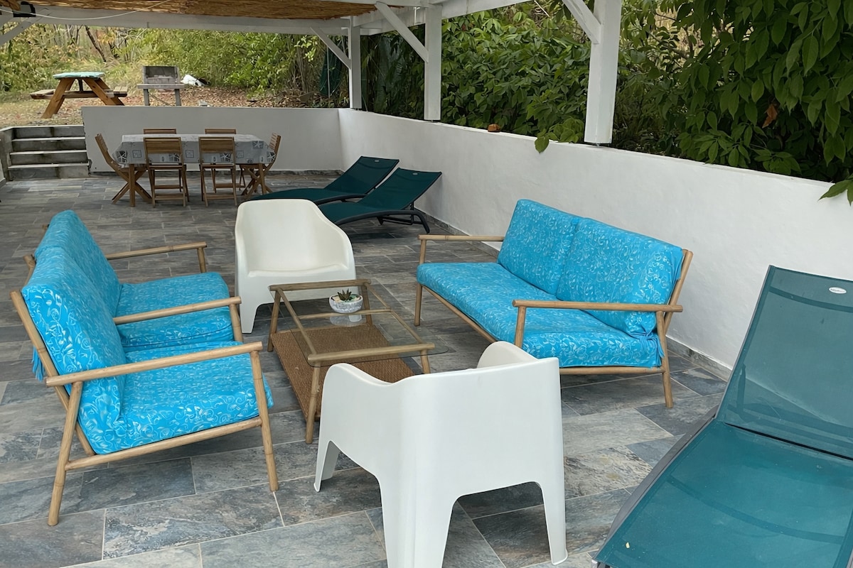 Comfortable ground floor 2-room flat (34 m2) with terrace in flowered garden, a 3-mn walk from the nice little beach of Anse Caritan. Air-conditioned bedroom , desk, a living-room, real kitchen, terrace where you can have your meals accompanied by birdsong, Wifi, washing-machine. The village 600m far offers all amenities (shops, post office, restaurants). Several beaches around, all different, including the beach of Les Salines, nautical activities, hiking. For couple, couple and 1 child.