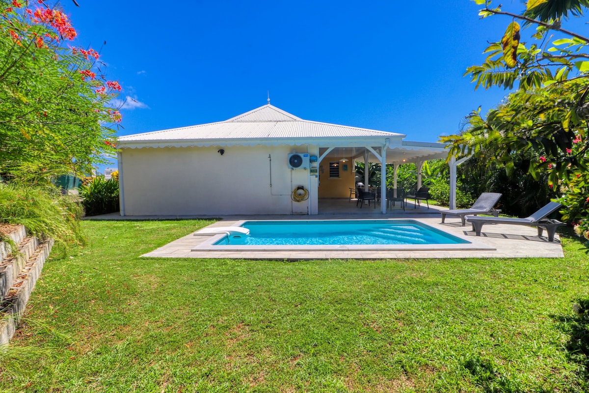 Notre villa se situe au Lamentin, commune du centre de la Martinique. Elle est donc le point de départ idéal pour la visite de l'île; tant au sud (magnifiques plages), qu'au nord (nature et randonnées pédestres). Une piscine de 8m×4,5 m a été construite en septembre 2019. Un petit carbet agrémenté d'un lit d'extérieur de 180×200 vous permettra de vous reposer en journée. Pour les professionnels et les accros de la connexion, la maison est fibrée en ultra haut débit ( 2Gbps environ par cable).