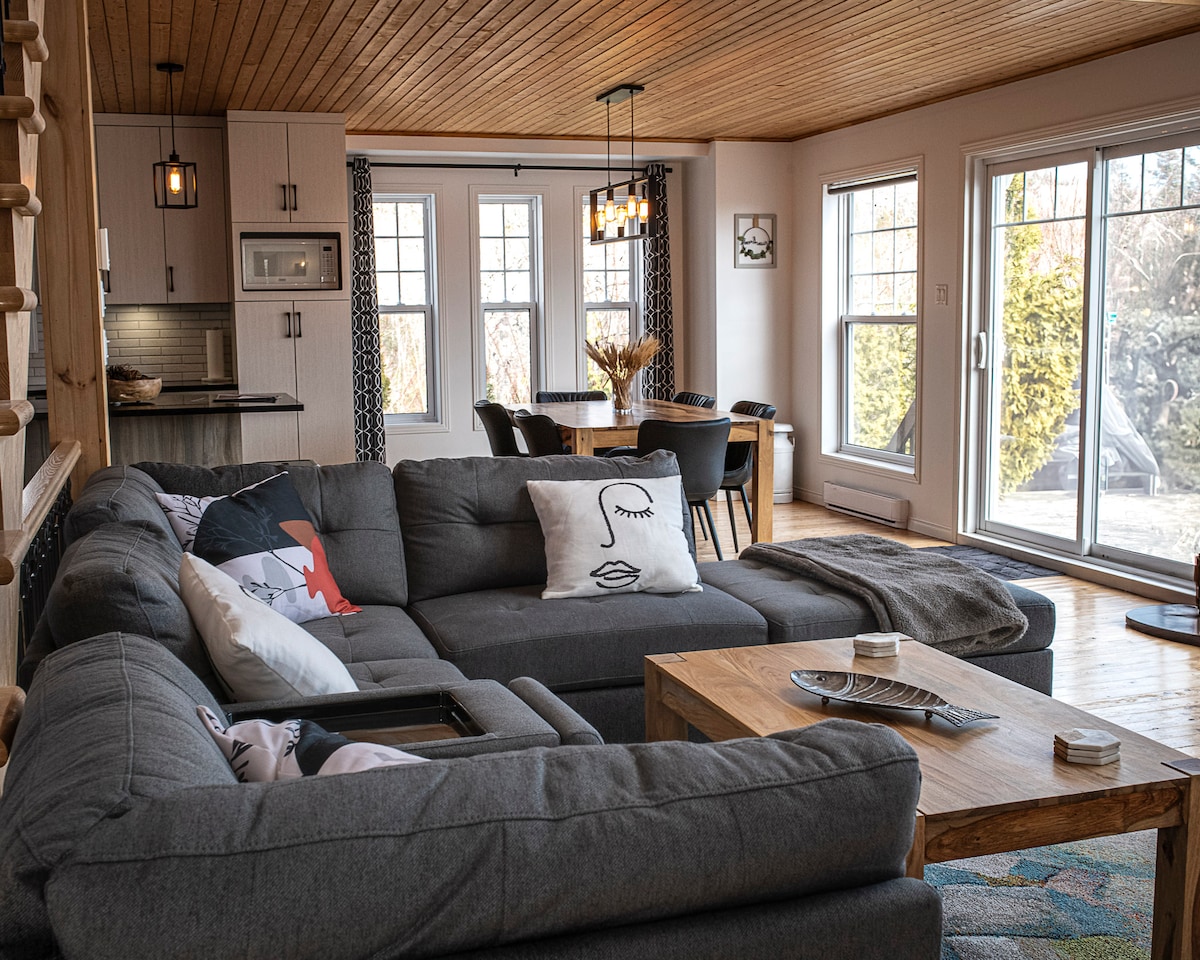 Experience 7 years of Superhost excellence in this modern Charlevoix haven. Perched on a mountain, our Zen retreat features forest-level windows and high-speed Fiber Optic internet. Just 10m from the top of Le Massif, 15m from the bistros and galleries of Baie-St-Paul and 1h from Quebec City. Enjoy "Northern Coziness" in a spacious living area designed for quality time. Ideal for quiet escapes; no parties or events. Your mountainside sanctuary for relaxation and exploration awaits. CITQ #298792