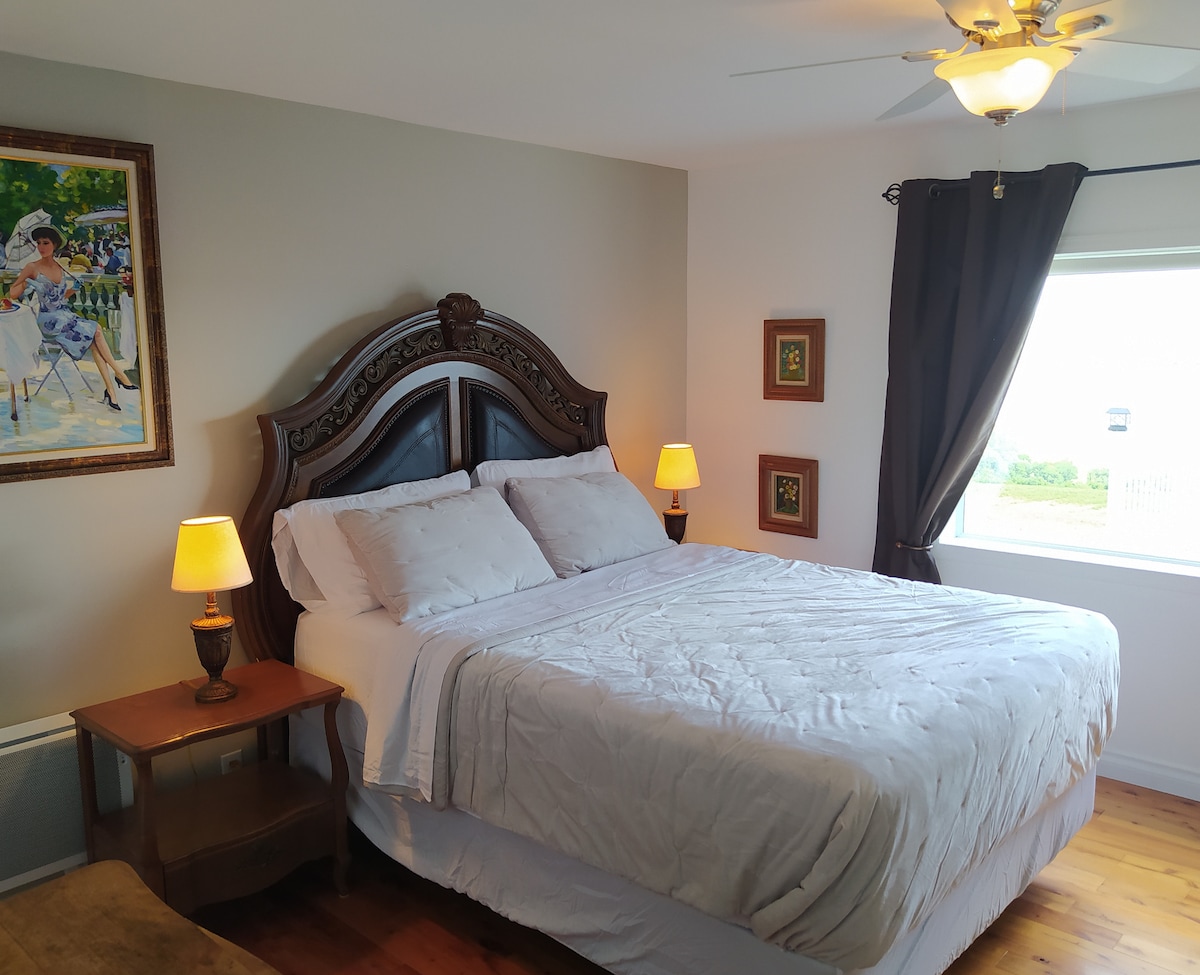 Magnifique petit appartement d’une chambre à coucher. Un divan lit pouvant accueillir une à deux personnes supplémentaires . Vue magnifique sur le fleuve St-Laurent et le Massif de Charlevoix. L’appartement est tout équipé, mais sans cuisinière, par contre un petit four, une plaque à cuisson, une mijoteuse , poêle à fondu , poêle à raquelette et bbq sont à votre disposition pour préparer vos repas ! Parfait pour couple ou petite famille voulant venir profiter de la région. CITQ 296001