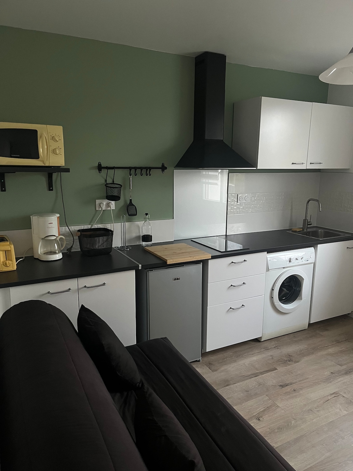 Appartement T2 meublé d’environ 50m² au RDC d’une maison individuelle avec entrée indépendante, à 10mn en voiture de l’hyper centre de Rodez. Parking privé gratuit 1 cuisine entièrement équipée four micro ondes réfrigérateur lave vaisselle cafetière lave linge. 1 salon avec téléviseur, BZ lit en 160 x 200 1 lit parapluie pour bébé 1 salle d’eau, WC indépendant 1 cellier. Accès à un jardin privé Des serviettes, draps et shampoing sont à votre disposition