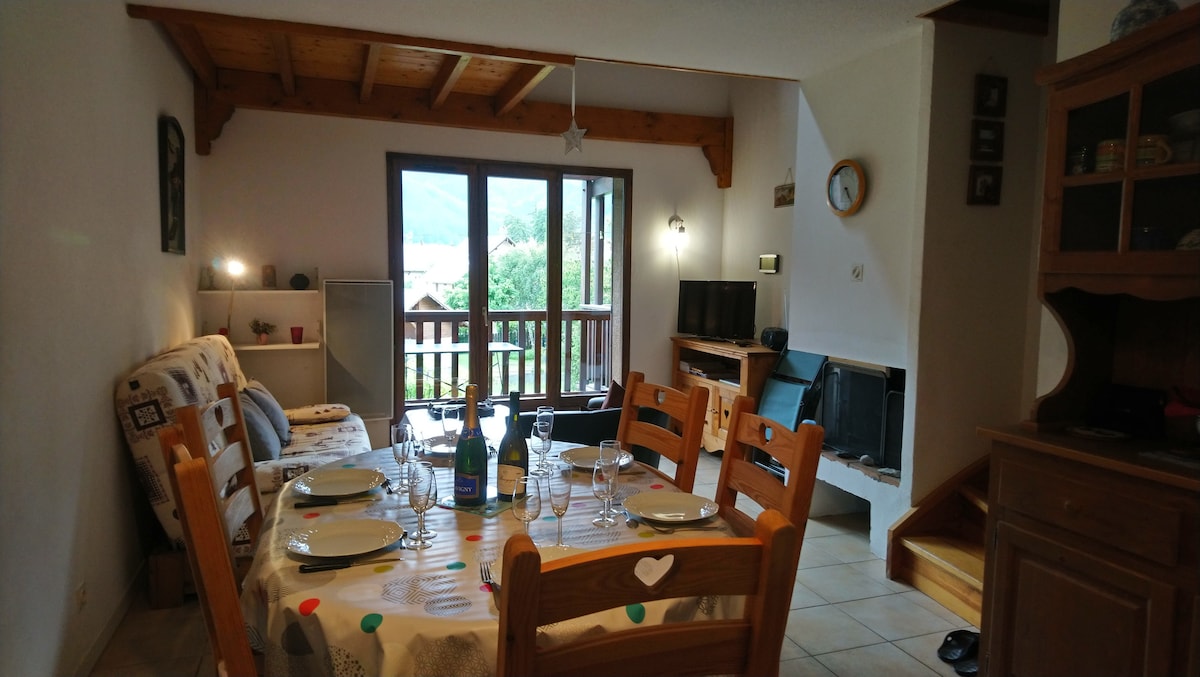 Appartement T3 sans vis à vis avec terrasse et jardin non clos. Séjour avec coin cuisine, 1 ch parentale avec lit double, coin nuit fermé avec 2 lits superposés et un canapé lit dans le séjour. Parking gratuit au pied de l'immeuble, casier à skis fermant à clé au RdC. L'appartement est situé à 500m du télécabine du Pontillas, à 800 du centre commercial de Pré-long. Le lac du Pontillas est à 350m. Logement paisible offre un séjour détente pour toute la famille. Draps et serviettes pour 10€/pers