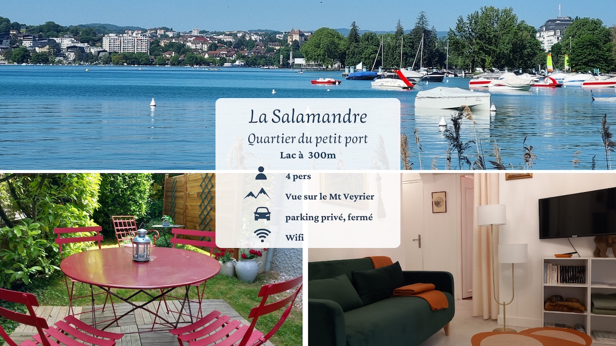 Studio tout confort, accès indépendant, jardin privatif, dans maison (habitée par les propriétaires). Situé à 7 mn à pied du lac (plages et activités nautiques, 25/30 mn vieille ville. Proche Carrefour Market, boulangerie, restaurants. Quartier calme, il comprend grand lit 160, canapé, WIFI, cuisine équipée (Nespresso), salle de douche/WC, accès direct au jardin avec table. Parking privé. Location vélos 6 vitesse Elops possible. Arrivée libre possible. Condiments de base. Appareil à raclette.