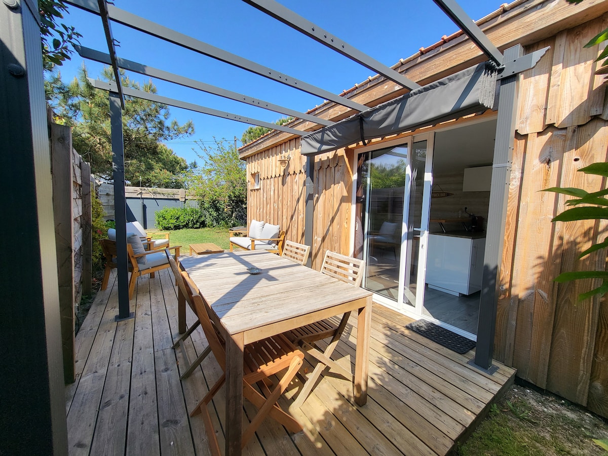 Cabanon de 22m², 1 salon avec cuisine américaine, 1 salle de bain avec douche italienne et WC, 1 chambre indépendante, une terrasse en caillebotis, 1 petit jardin. Le logement, indépendant, est situé dans le jardin de notre maison. Il est situé à 100m du caillebotis menant à la plage surveillée de l'Horizon. L'impasse donne accès au chemin du littoral, pour de belles promenades le long de la pointe du CAP FERRET. Le marché, le centre ville et le débarcadère sont à 1km à pied.