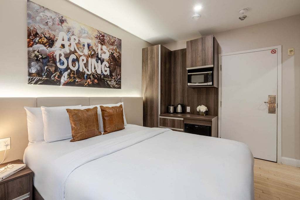 This elegant hotel room blends style and comfort, featuring a plush queen bed with premium linens. Located in one of Montreal’s most vibrant neighborhoods, you’re steps from cafés, bars, and cultural gems. Guests also enjoy access to a welcoming lobby lounge and a spacious basement with cozy seating, a pool table, and big-screen TV—perfect for work or relaxation.