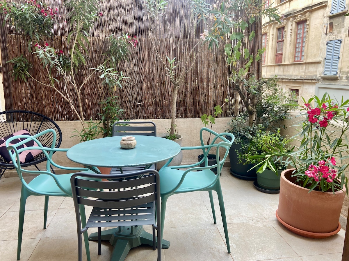 This beautiful apartment is in a 14th century Classified Historical Monument building ; minutes from the Palace of the Popes and from the central train station of Avignon! Free Private parking, elevator, AC, floor heating, big terrace, quiet and next to Les Halles, the best food market in town. It is lacated on the third floor with an elevator to take you there.