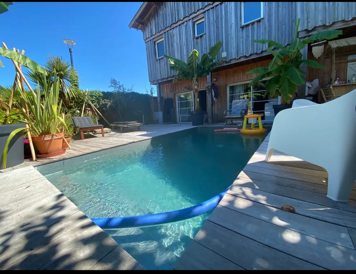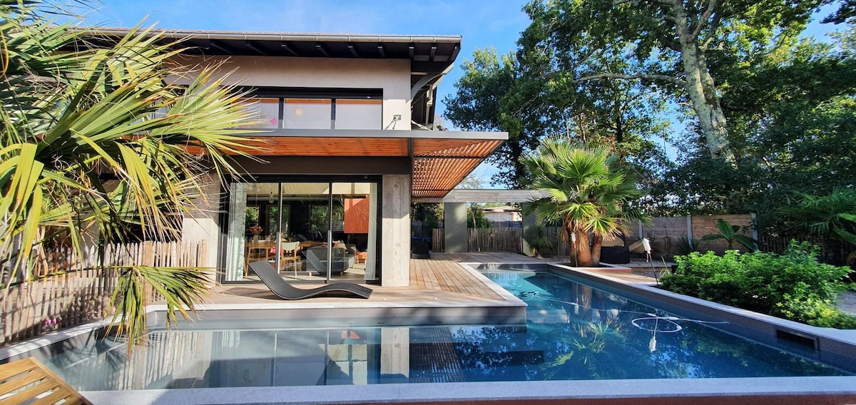 Villa d'architecte proposée pour 10 couchages, climatisée. Située à moins de 5 min à pieds des commerce de proximité et des plages du bassin d’Arcachon (village Grand Piquey). voiture nécessaire pour aller sur les plages Océanes en 5 min (15 min du centre du cap ferret) Piscine chauffée de 15m chauffée du 15 Mai au 15 Septembre selon conditions climatiques et intempéries (avant et après cette période , elle est hivernée et/ou bâchée) un véritable cocon de verdure