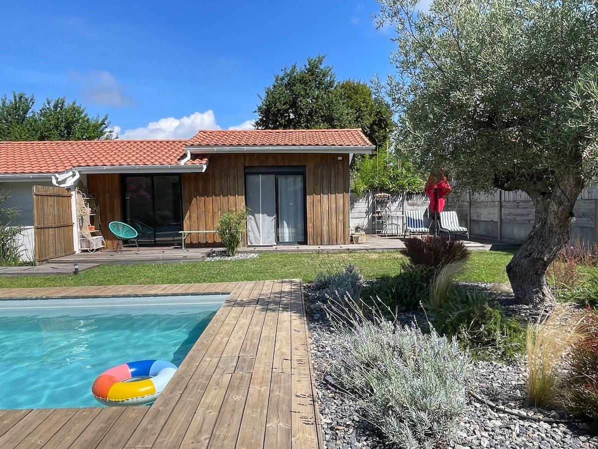 Entire house 6 travelers 3 bedrooms - 5 beds - 2 bathrooms - private swimming pool - several terraces - parking (electric charger). “Cabin” on the port of La Teste. 10 minutes from the beaches and dune of Pilat. Authentic oyster farming district. Train station 400m away. Atypical for the comfort provided by the wood, its terraces, its water environment (between the port and the 'canelot'), its views, its swimming pool and the neighbor's oysters - the best in the Basin. This is my personal home.