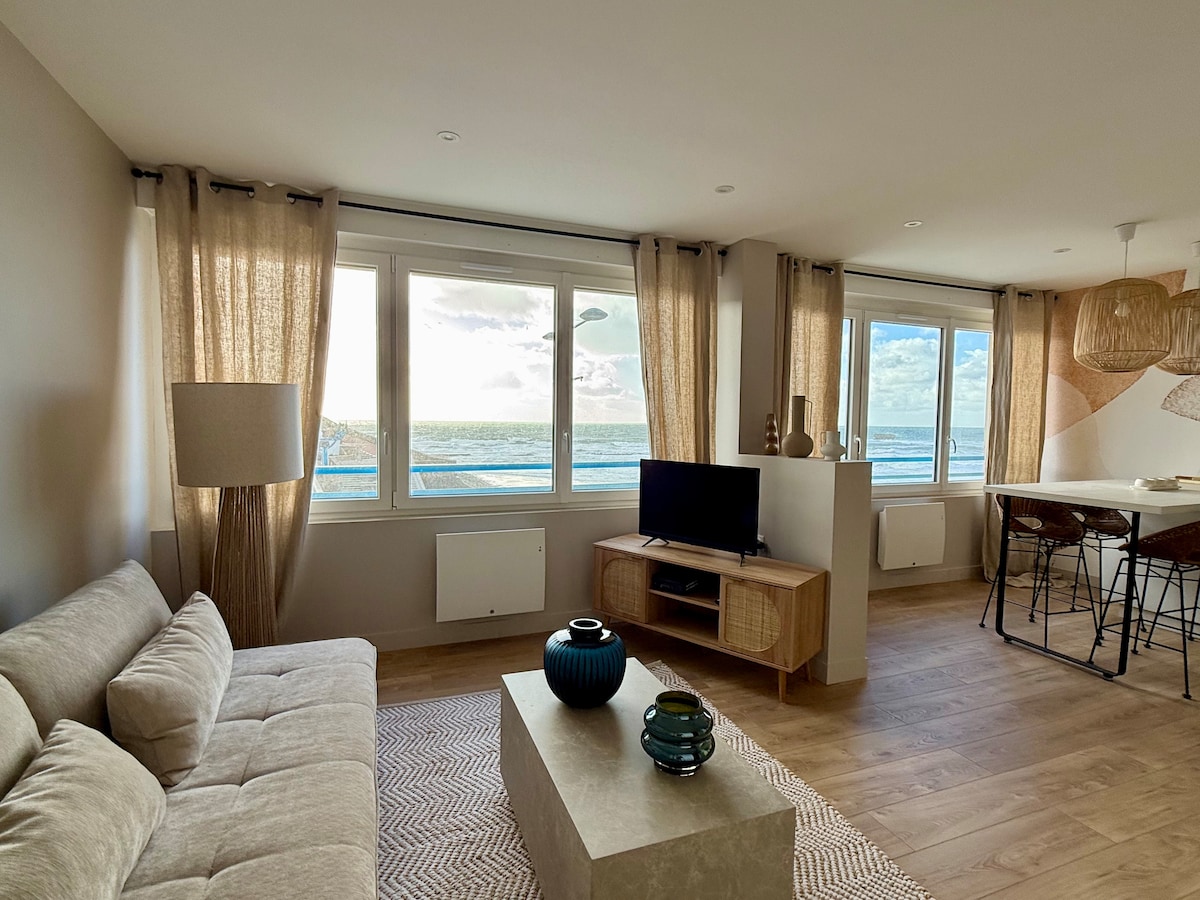 Appartement de 50m2, refait à neuf, au 1er & seul étage d'une petite copropriété sécurisée. Il peut accueillir 4 personnes et 1 bébé. Il comprend une entrée avec grand dressing, une chambre avec rangement, un salon, salle à manger avec cuisine ouverte toute équipée. Situé à 2 min à pieds de la plage et à 300m du centre ville avec tous ses commerces (boulangeries, fromagerie, boucheries, poissonnerie, pharmacie, restaurants, bowling....). Place de garage sécurisée située au pied de l’immeuble.